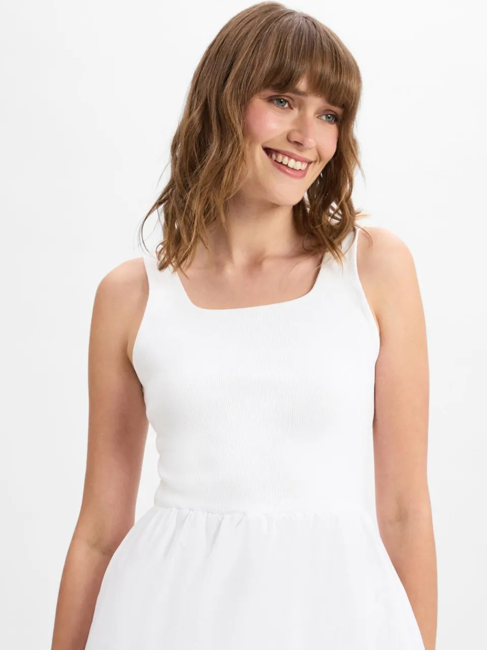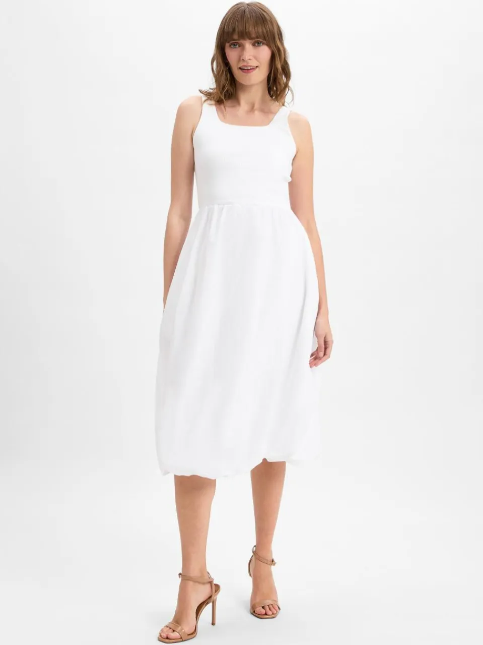 Dieses sommerliche Highlight besticht durch sein strahlendes Reinweiß: Das luftige Midikleid von rich&royal vereint ein geripptes Jersey-Top mit einem voluminösen Rock, während die breiten Träger und praktischen Eingrifftaschen ihm eine charmant sportive Eleganz verleihen.