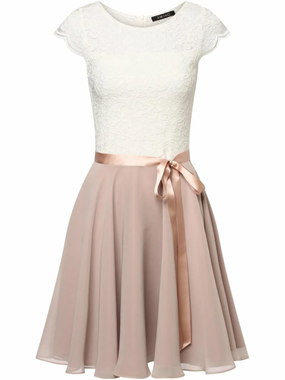 Ein zuverlässiger Material-Mix, der pure Romantik ausstrahlt, prägt das Abendkleid von Swing aus Spitze, Chiffon und mit schimmerndem Satingürtel.