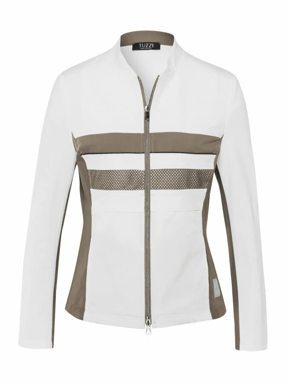 Sportive Jacke mit kontrastierenden Einsätzen und modernem Mesh-Detail. Die taillierte Passform sorgt für eine feminine Silhouette.