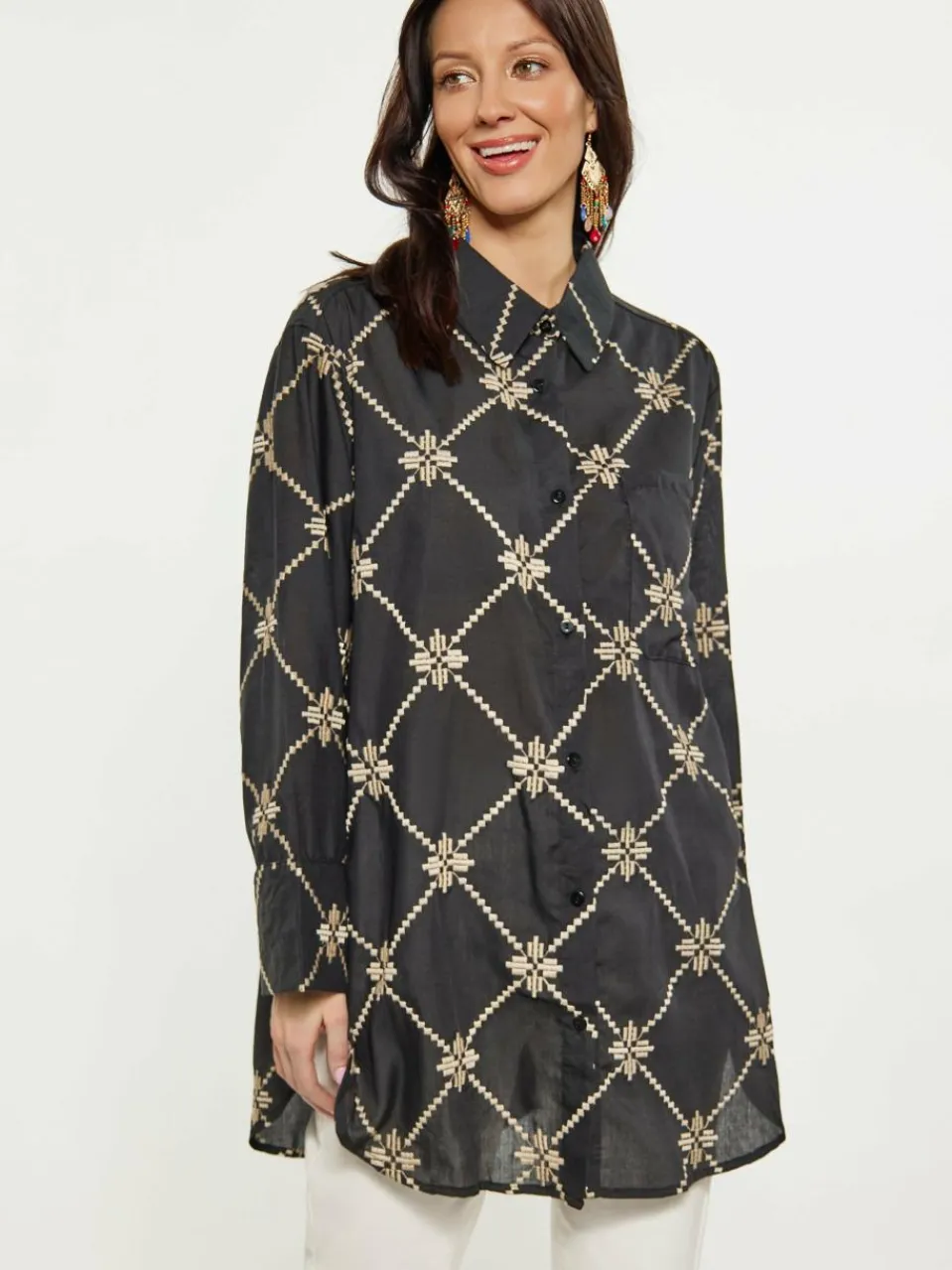 Discover the charm of this shirt with special embroidery, designed for both comfort and style. The buttoned-up front and pointed collar enhance its sophistication, while wide sleeve ensure ease of movement. Ideal as a festival shirt or casual wear, this cotton shirt features a unique pattern and a single chest pocket.