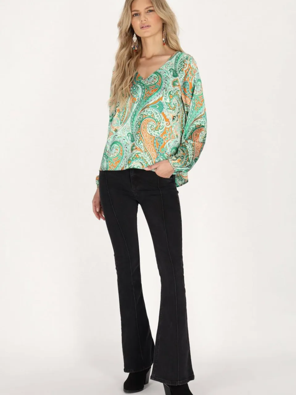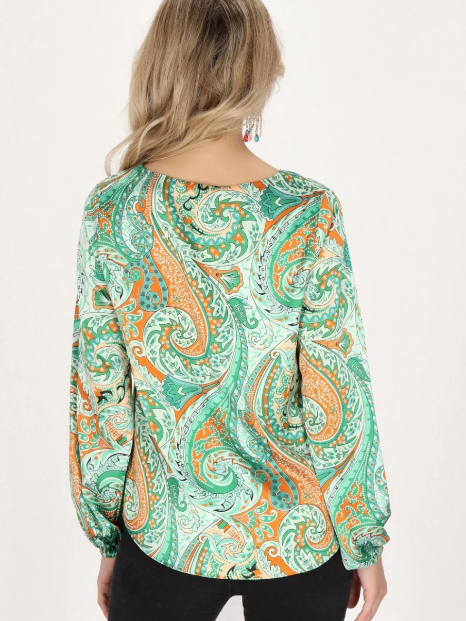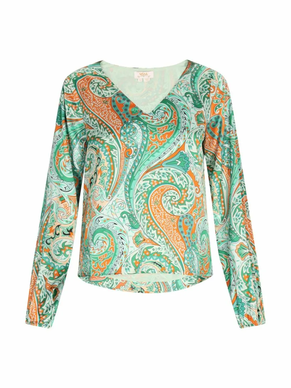 Schmücken Sie sich in dieser exquisiten langärmeligen Bluse, die mit einem faszinierenden V-Ausschnitt und komplexen wirbelnden Motiven, floralen Designs und Paisley-Elementen prahlt. Die figurbetonte Silhouette mit einem Saum unterhalb der Taille strahlt Eleganz aus. Gerade Ärmel, die an den Handgelenken enden, ergänzen den verstärkten Ausschnittsrand. Ein leichter Stoff mit glatter Textur sorgt für Komfort und Stil. Vollendet mit einem dezenten Markenetikett für Authentizität.