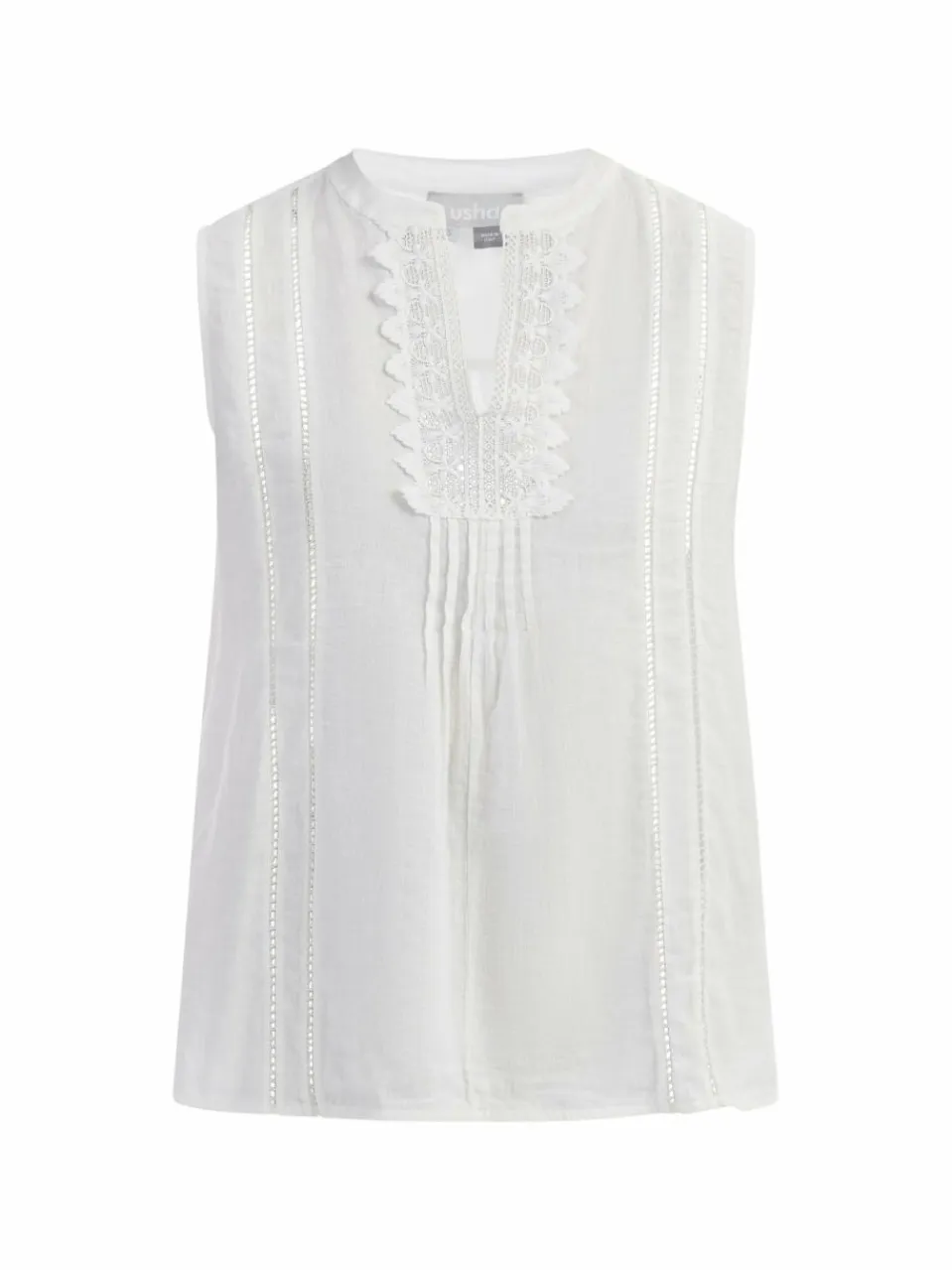 Das zarte Leinen-Viskose-Gemisch trägt sich nicht nur luftig, es schmiegt auch entspannt der femininen Silhouette an. Das Modell von usha wurde in Italien gefertigt und mit feiner Spitze verziert. Die leichte, ärmellose A-Form und der Serafino-Ausschnitt mit femininem V-Ausschnitt und Fältchen runden das sommerliche Design gekonnt ab.