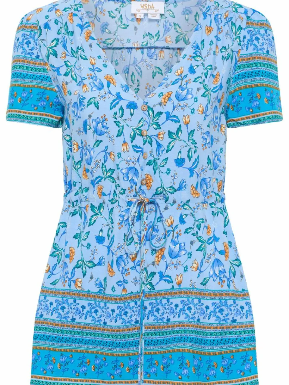 Romantisch-verspielt mit dem für usha FESTIVAL typischen Boho-Flair starten wir in den Sommer. Das aus leichter Viskose gefertigte Modell überzeugt mit seinem tiefen V-Ausschnitt, einem floralen Print und dem Bändchen-Tunnelzug für eine feminine Taillierung. Kleine Knöpfe und eine Bordürenoptik an Ärmeln und Saum verleiht dem Design einen aufgelockerten Twist.
