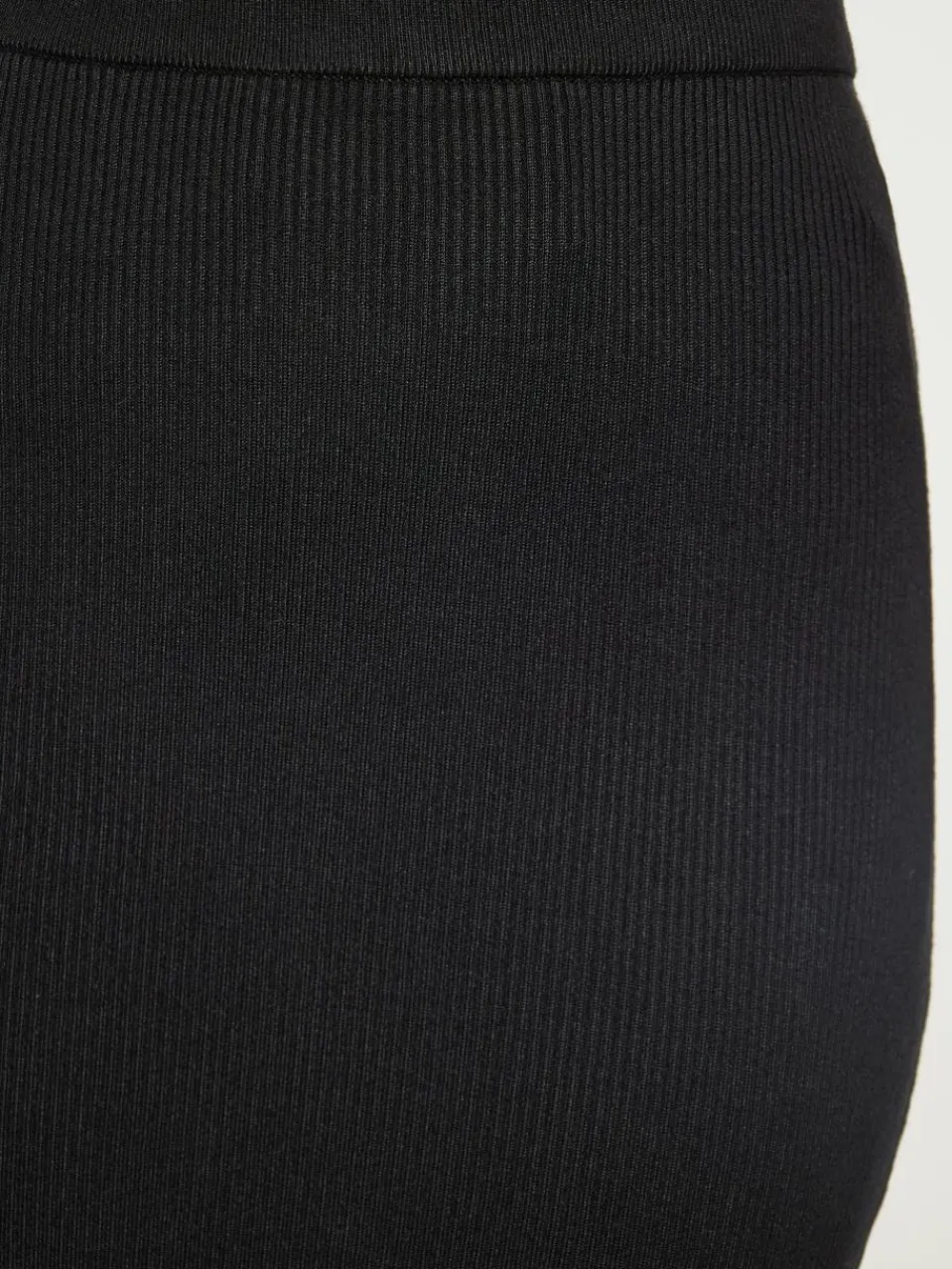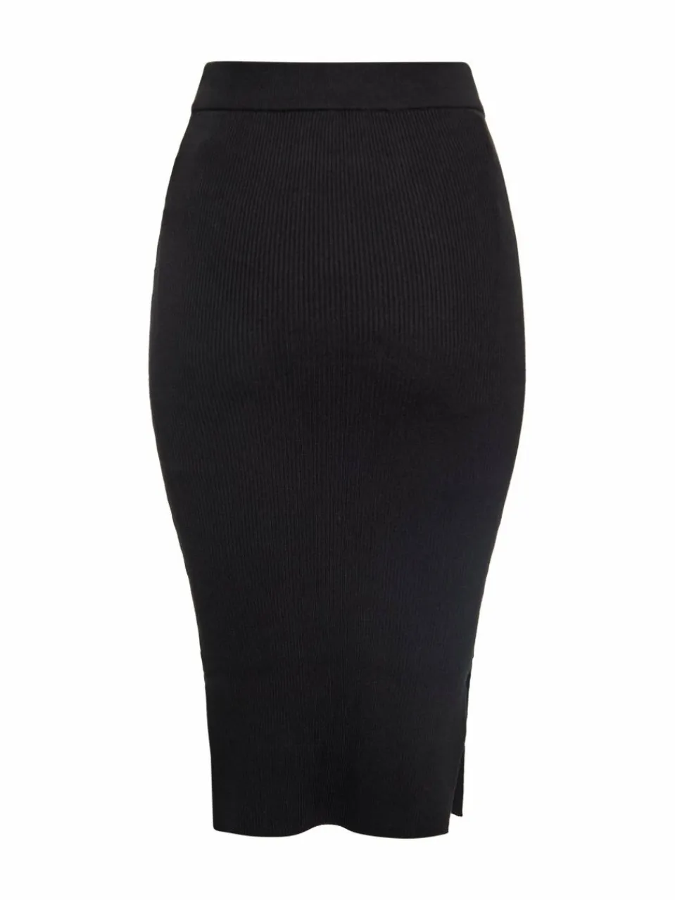 This elegant knitted pencil skirt features a ribbed structure for a sophisticated office look. The high waist with finely ribbed texture and fitted silhouette create a sleek, form-fitting style that contours to the body’s shape. Perfect for adding a touch of sophistication to your wardrobe, this midi skirt is designed to provide both stretch and structure for a flattering fit.