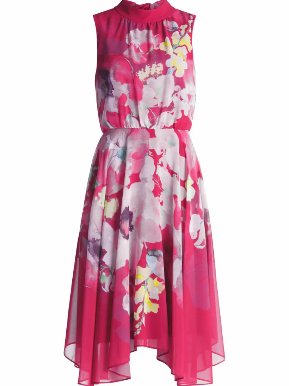Die sommerlichen Farben dieses Chiffonkleides versprühen direkt gute Laune! Der florale Druck und das ausgestellte Design verleihen dem Kleid eine frische, elegante Ausstrahlung. Der Bindegürtel betont die Taille und sorgt für eine feminine Silhouette. Der Reißverschluss ermöglicht einen einfachen Einstieg. Ein perfektes Kleid für sonnige Tage oder festliche Anlässe – ein wahrer Blickfang mit einer fröhlichen, eleganten Note!