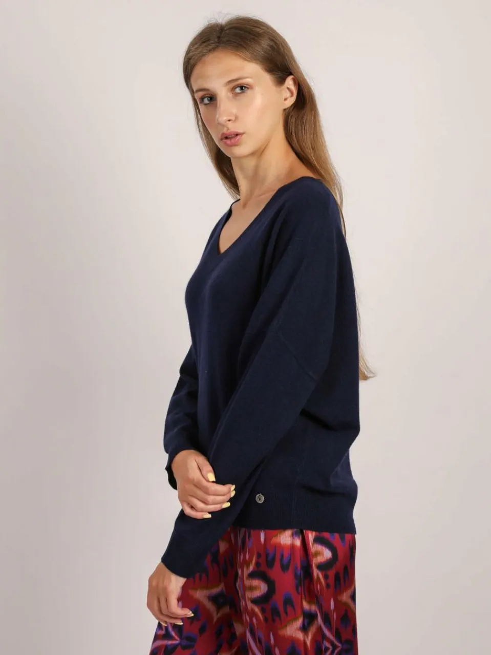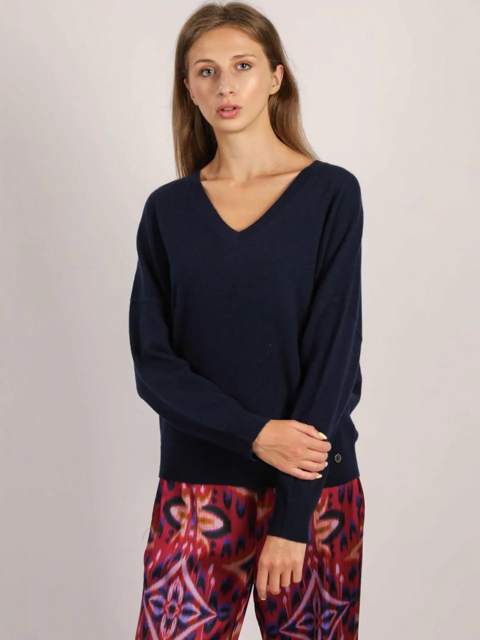 Mit dem V-Ausschnitt-Pullover lassen sich schnell neue Outfits zusammenstellen. Die langen Ärmel enden in einem Strickbündchen, das die Wärme schön drinnen hält. Dieser Pullover ist hüftlang sowie figurumspielend geschnitten, sodass der Oberkörper locker betont wird. Der Feinstrick aus Woll-Kaschmir-mischung hält dich warm und ist auch sehr bequem. Model trägt Größe 36 – Gesamtlänge: 60 cm, Brustweite: 132 cm, Schulterbreite: 71 cm.