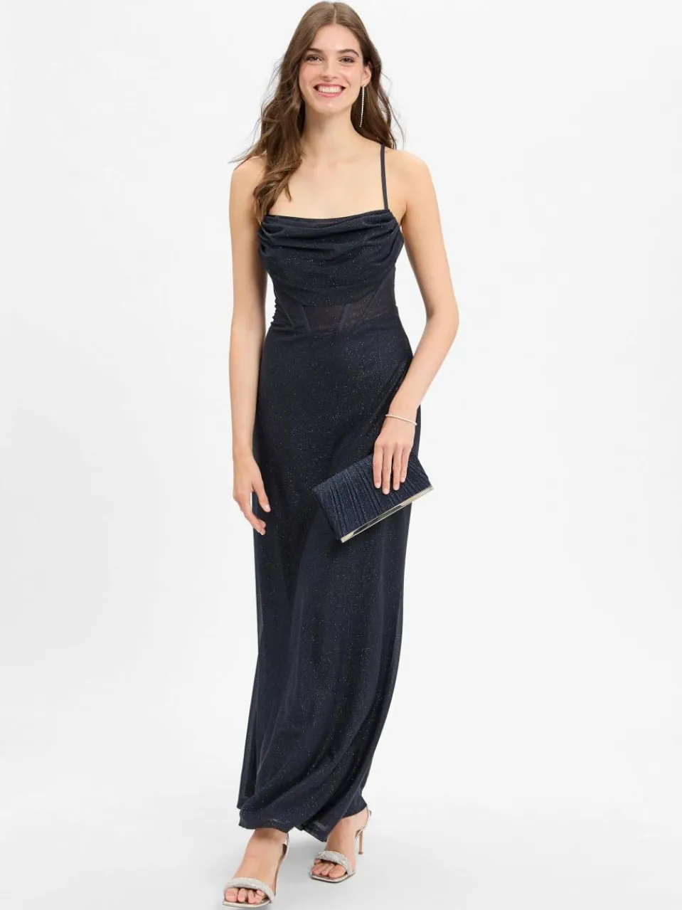 Das bezaubernde Abendkleid von Vera Mont entführt einen mit seinen funkelnden Glitzerapplikationen und der eleganten Corsage in eine Traumwelt unter dem Sternenhimmel, während das atemberaubende Rückenfrei-Design einen Hauch von Extravaganz verleiht.