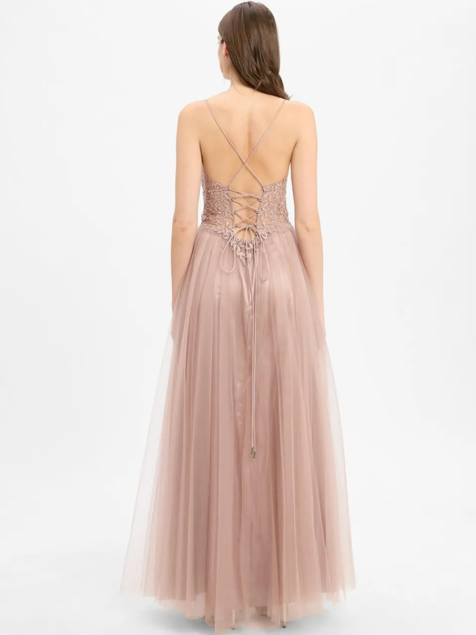 Das traumhafte Abendkleid von Vera Mont verzaubert mit einem kunstvollen Spitzenbesatz, der mit funkelnden Ziersteinen akzentuiert ist, und einer verstellbaren, rückenfreien Bindung, während der fließende Chiffonunterteil elegant in sanften Wellen zu Boden gleitet.