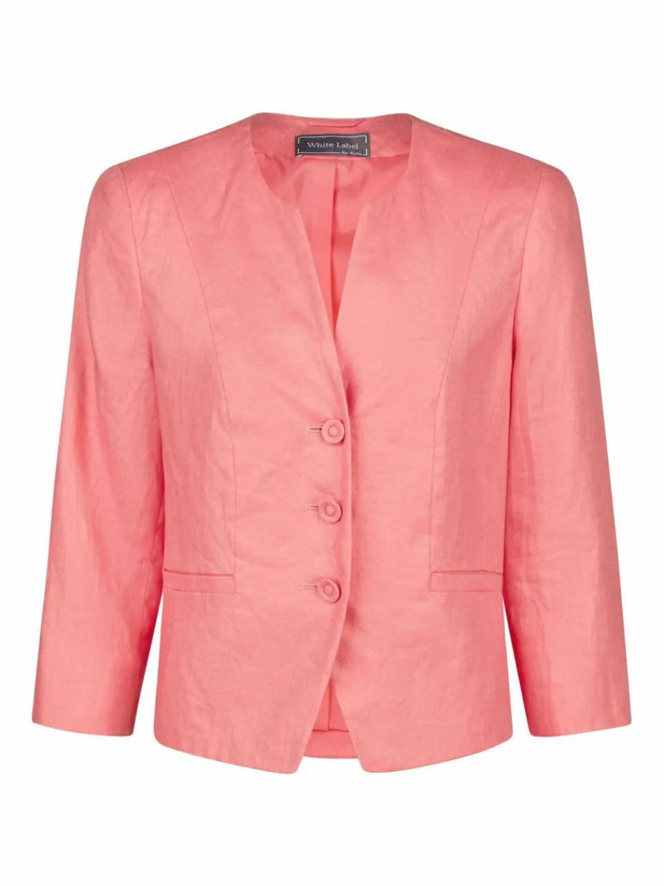 Leicht und stilvoll – das kurze KleiderjäckchenDieses kragenlose Blazer-Jäckchen aus Leinen verleiht deinem Look Leichtigkeit und Eleganz. Mit drei Stoff-überzogenen Knöpfen, Leistentaschen und 3/4-Ärmeln mit Schlitz ist es sowohl funktional als auch modisch. Die Länge in Gr. 38: 54 cm macht es zu einem idealen Begleiter für Frühling und Sommer. Ein perfektes Kleidungsstück für feminine, entspannte Outfits!