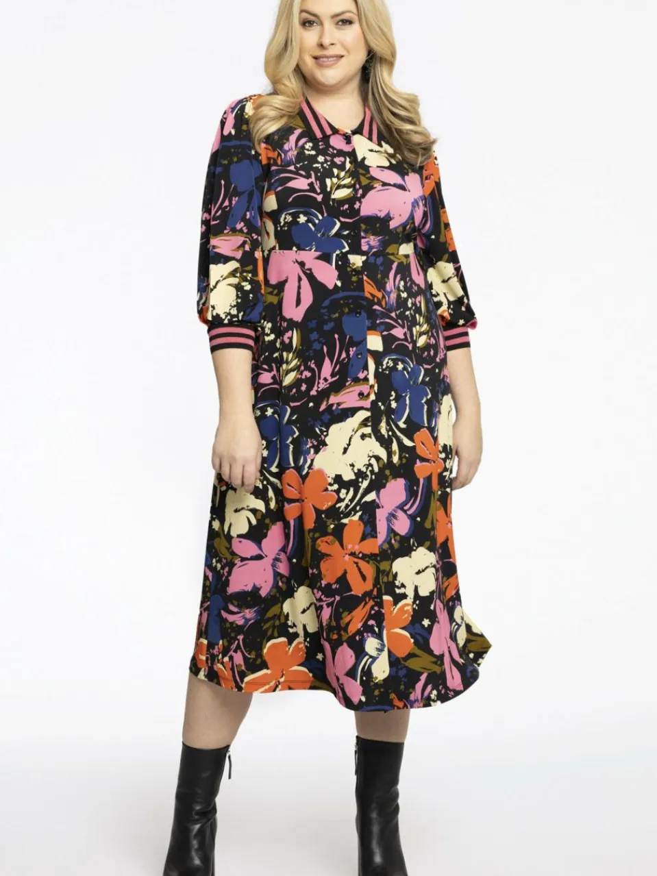 Dieses farbenfrohe Kleid ist aus unserem herrlichen Dolce-Stoff gefertigt. Es ist an der Vorderseite geknöpft, hat angeschnittene Ärmel und ist ab der Taille weiter geschnitten. Ebenso wie die Ärmel ist der Kragen mit einer sportlichen Bordüre verarbeitet.