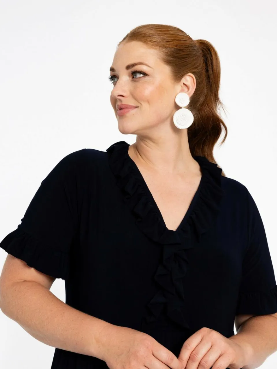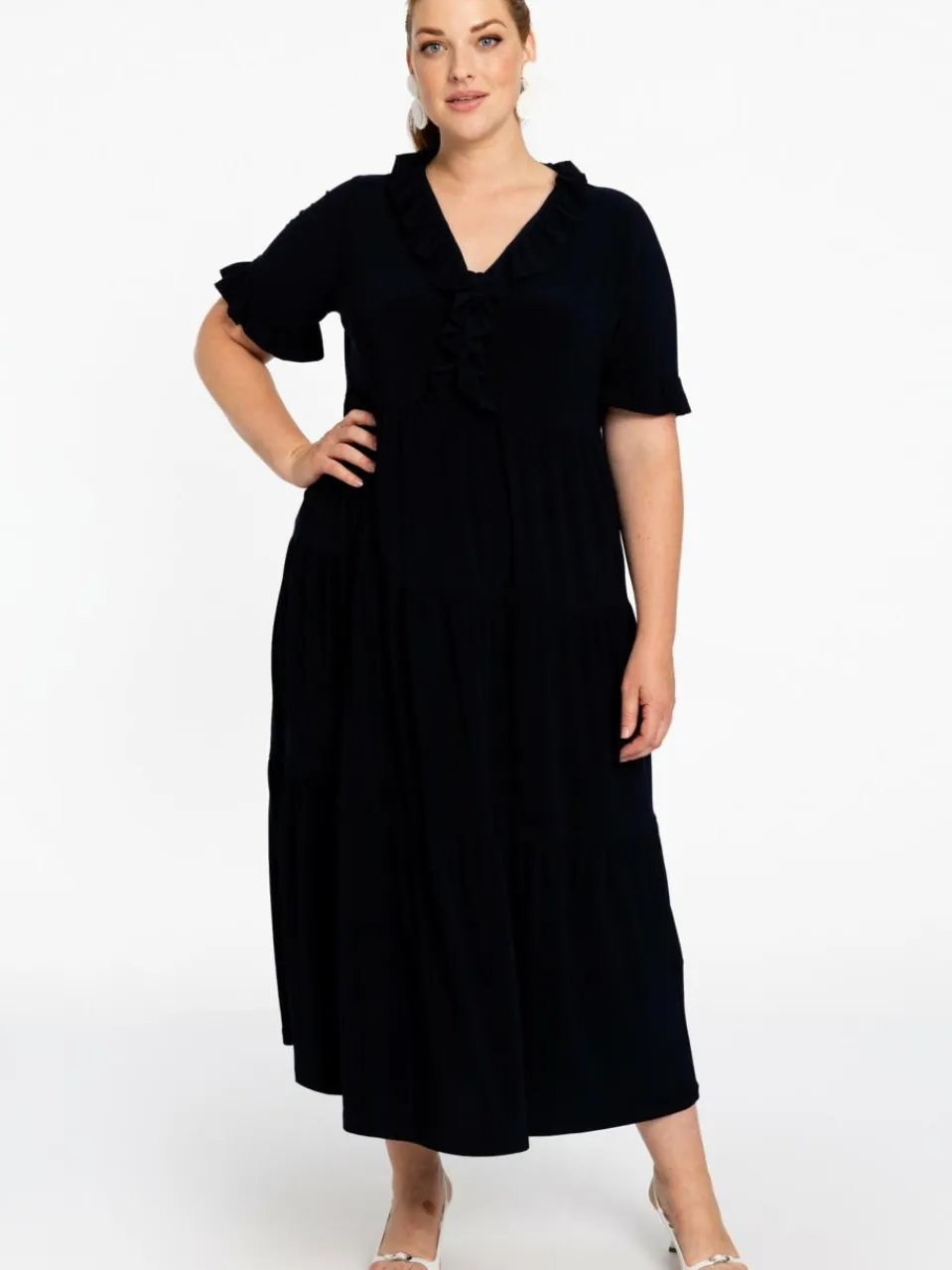 Ein elegantes, mit süßen Rüschen verziertes Kleid. Dieses einfarbige, lange Kleid kann zu den Modellen gehören, die Sie an wärmeren Tagen mit Sandalen im Büro oder mit silbernen High Heels zu einem schicken Abendessen mit Freunden tragen. Das Kleid hat einen gerüschten Ausschnitt und gerüschte Ärmel. Hergestellt aus dem Dolce-Travel-Material, daher perfekt zum Mitnehmen im Koffer.