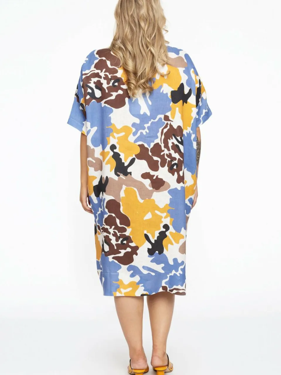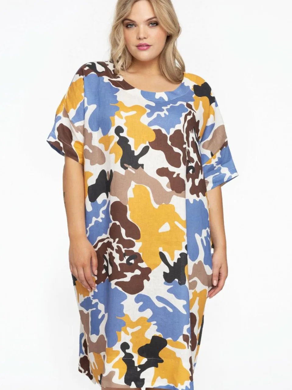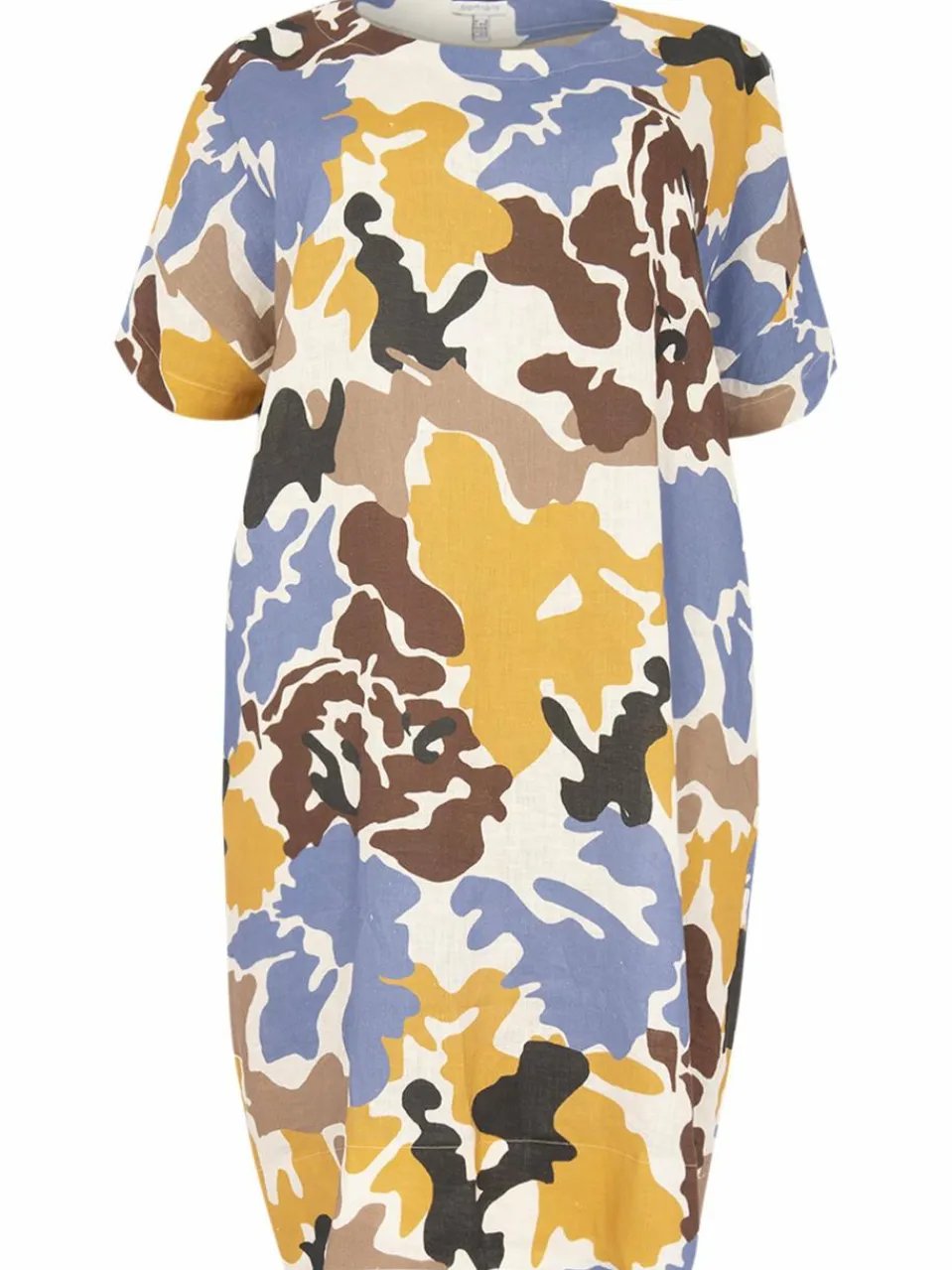 Verschiedene Formen in Senf-, Blau- und Brauntönen zieren dieses weit geschnittene Kleid. Das Leinenkleid hat einen weiten Rundhalsausschnitt und Eingrifftaschen.