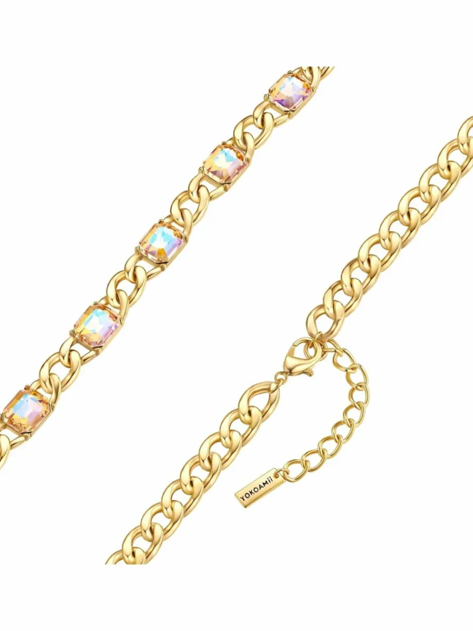 Du wünschst dir ein außergewöhnliches, aber erschwingliches Accessoire? Diese Kette des jungen Trendlabels YOKOAMii fasziniert Fashionistas mit ihrem modernen Materialmix und einem markanten Design. Eine grobmaschige Panzerkette schmiegt sich in dein Dekolleté, verziert mit großen, kubusförmig geschliffenen Glas-Kristallen – eine spannende Verbindung zwischen