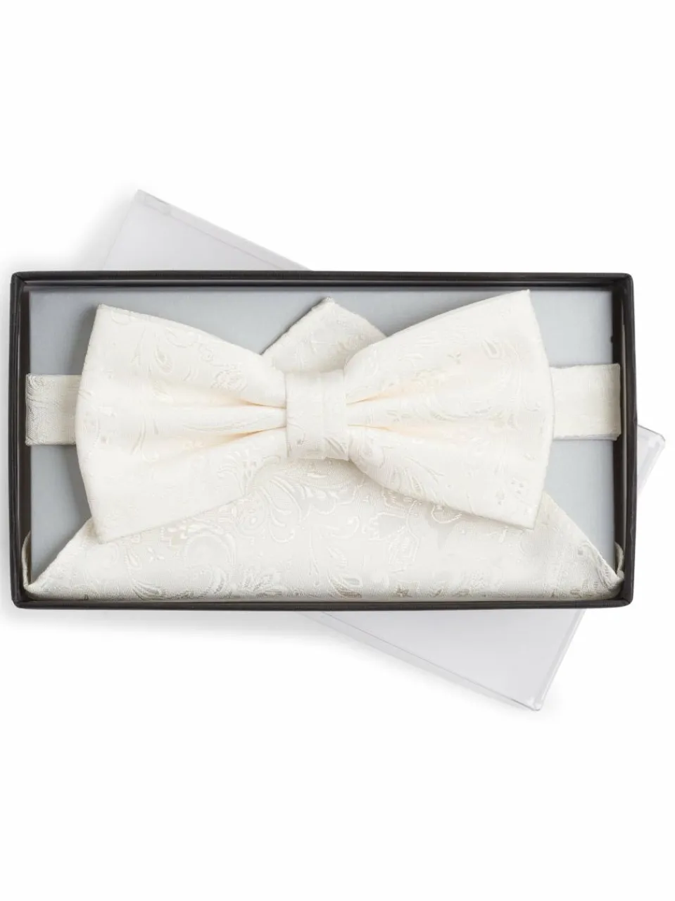 Fliege und Einstecktuch sind essentielle Elemente klassischer Smokings: Das vorliegende Set stammt aus dem Hause Digel und zeichnet sich durch ein edles Jacquardmuster aus.