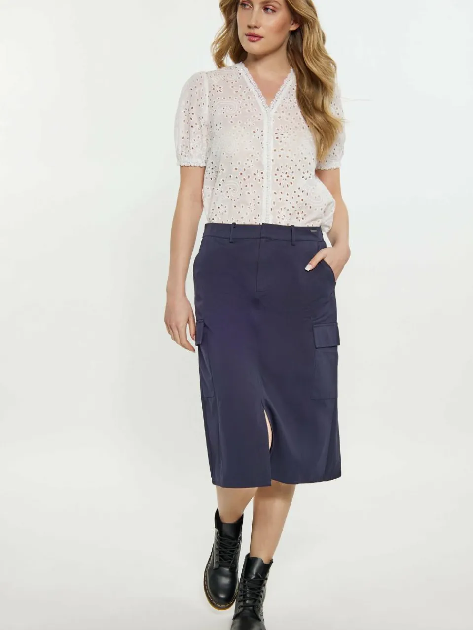 Accentuate your wardrobe with this cotton skirt with a back slit for freedom of movement. There are two functional patch cargo pockets on the front, which add utility to the minimalist design. The skirt will be a great element of a summer styling.