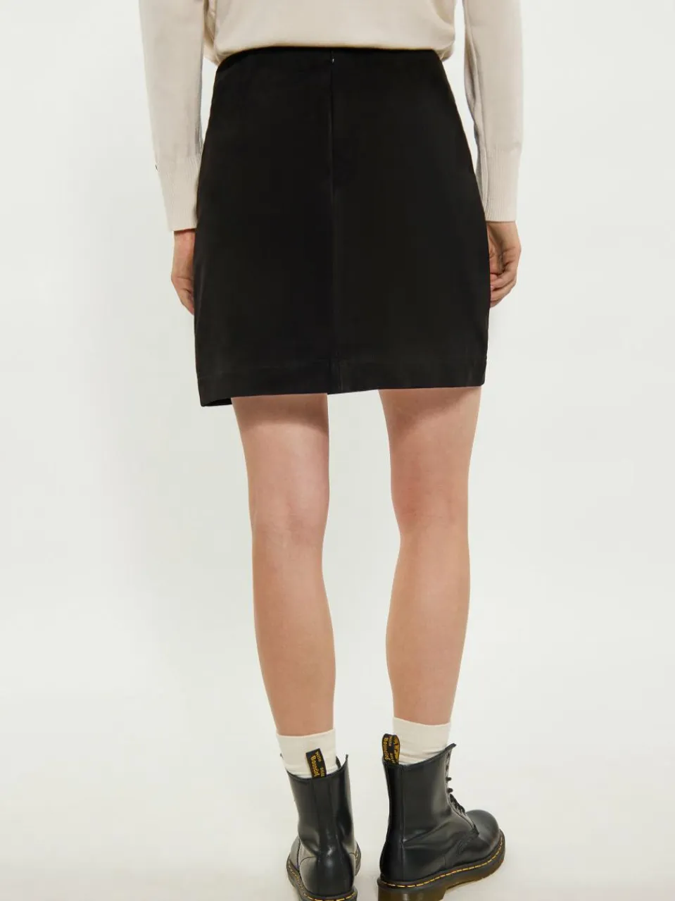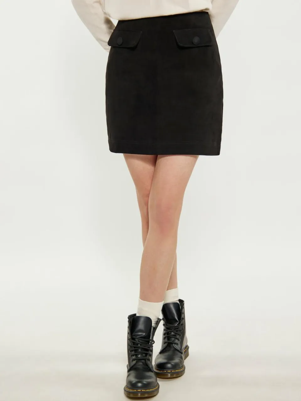 Dieser hoch taillierte, gerade geschnittene Rock endet oberhalb des Knies und strahlt Raffinesse aus. Die glatte Vorderseite und die aufgesetzten Taschen mit Knöpfen verleihen ihm eine elegante Note. Aus weichem Material in Wildlederoptik gefertigt, das eine strukturierte Oberfläche bietet, kombiniert er Struktur und Flexibilität in der Passform. Mit sauberem Saum und verdecktem Verschluss ist dieser Rock perfekt für alle, die einen gepflegten und dennoch vielseitigen Look suchen.