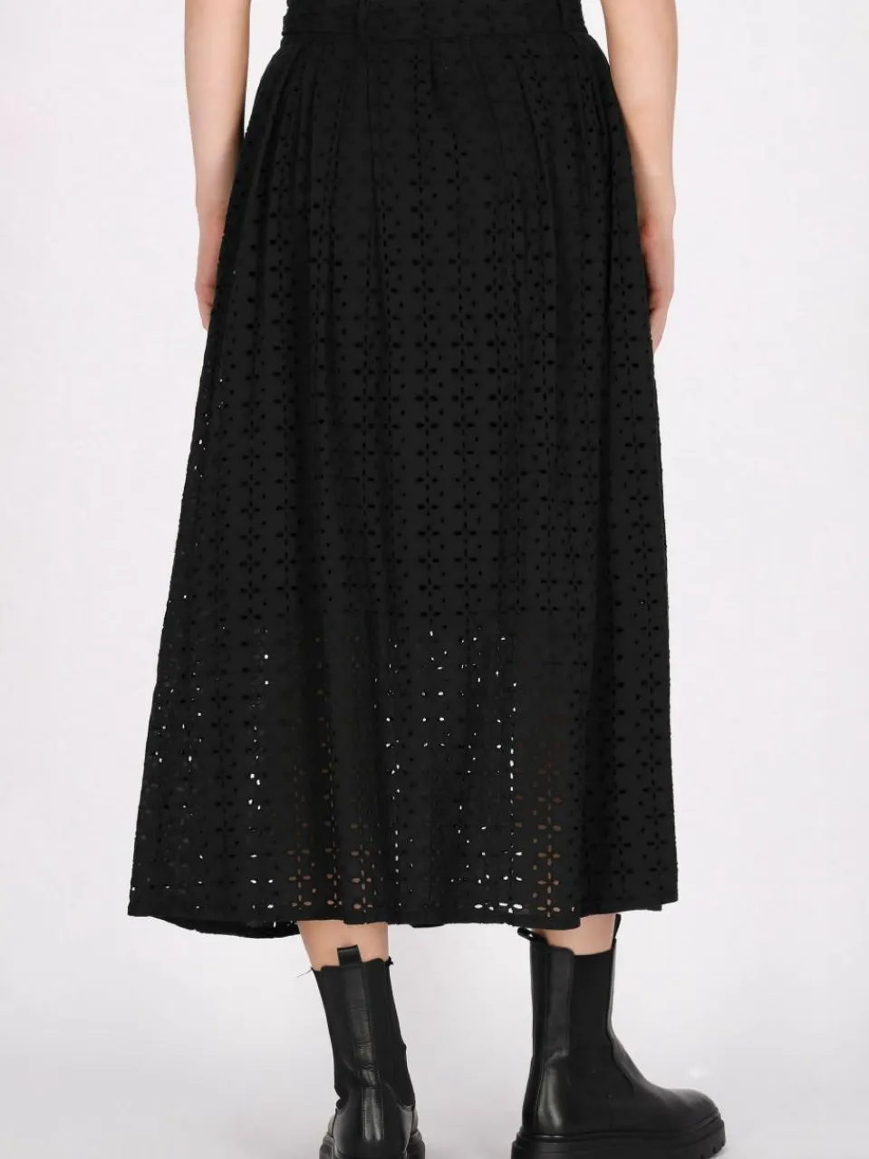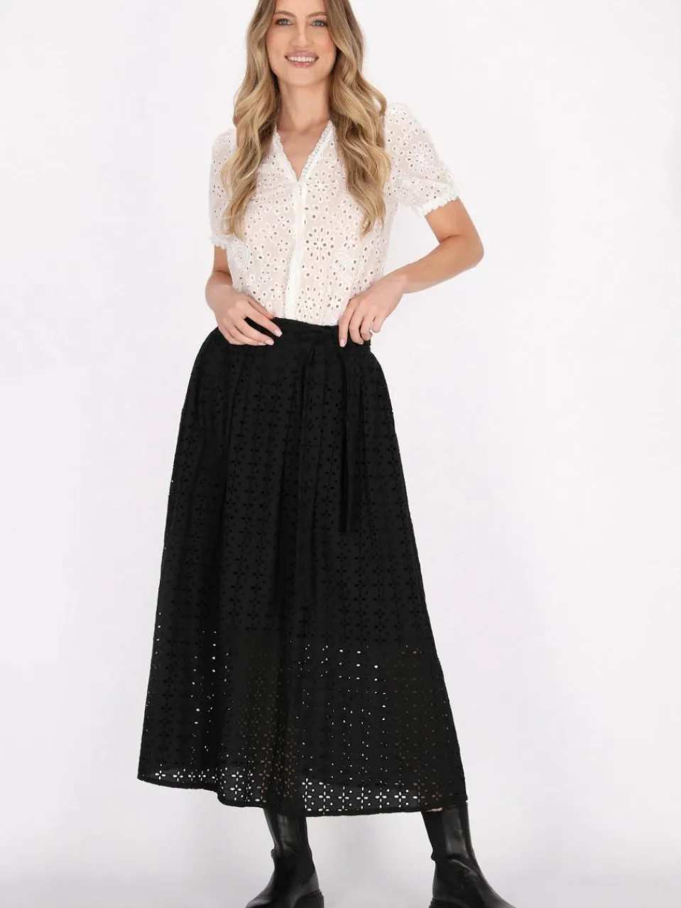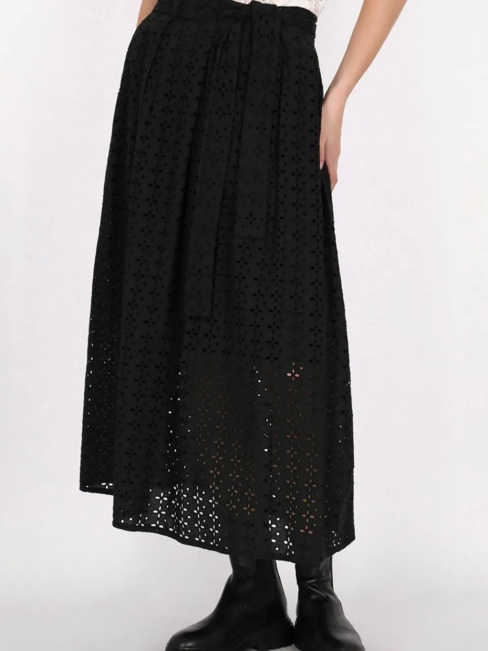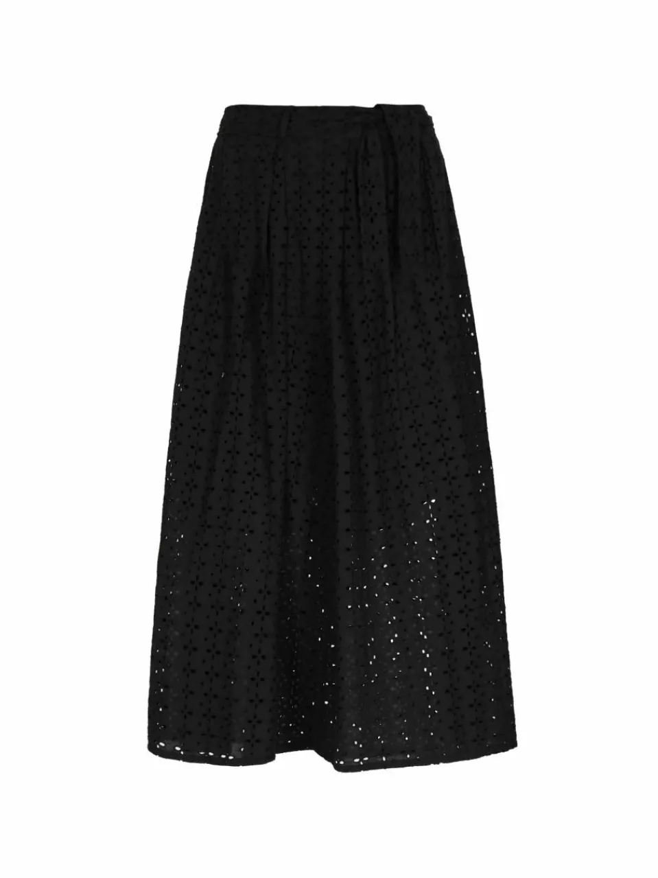 Accentuate your summer look with this high-waisted midi skirt with a stylish tie. Made of light cotton, translucent material on the lining, it has delicate openwork decorations that add texture. Gracefully reaching mid-calf, this elegant design has an A-line silhouette, perfect for casual outings.