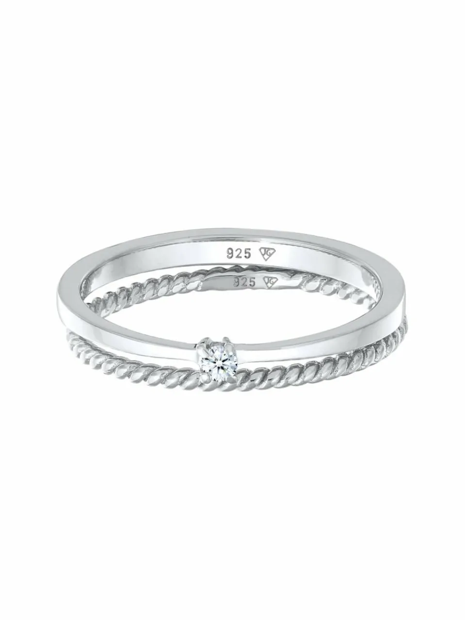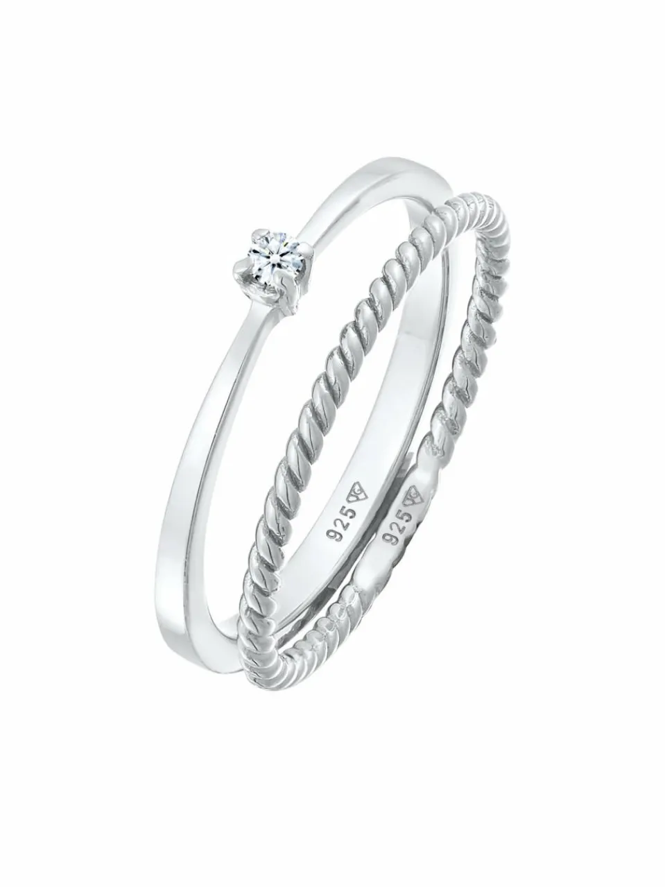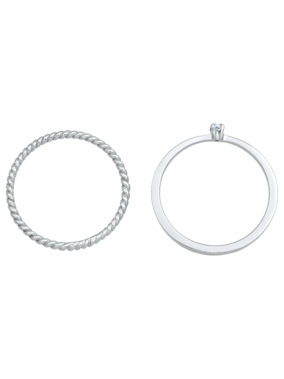 Dieses harmonische Ring-Set zieht alle Blicke auf sich. Der filigrane Solitär-Ring ist mit einem weißen Diamanten (0.03 ct) im Brillantschliff geschmückt. Stilvoll kombiniert verleiht der Stapelring im Kordeldesign ihrem Outfit den letzten Schliff. Zusammen oder einzeln getragen, strahlt dieses Set eine elegante Optik aus.Sie erhalten den Diamantschmuck in einem eleganten Schmuck-Etui.