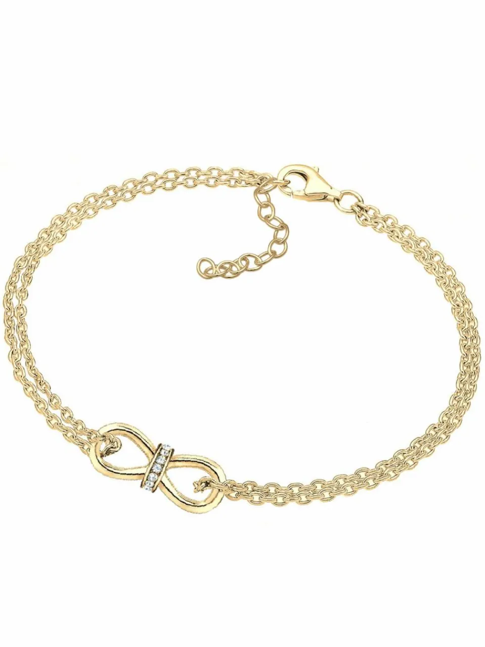 Warmes Gold trifft auf cooles Design: Dieses trendige Infinity-Armband wurde mit viel Liebe zum Detail aus vergoldetem 925er Sterling Silber gefertigt. Die 14 funkelnden Swarovski® Kristalle geben dem Armband ein leuchtendes Finish und bringen Ihre Trägerin zum Strahlen. Durch das besonderes und trendige Design ist der Armschmuck ein Must-have für alle die Design und Fashion lieben, und darf in keinem Schmuckkästchen fehlen.Dieses Armband ist in der Größe 16 cm und 18 cm erhältlich (+ 3 cm Verlängerung)