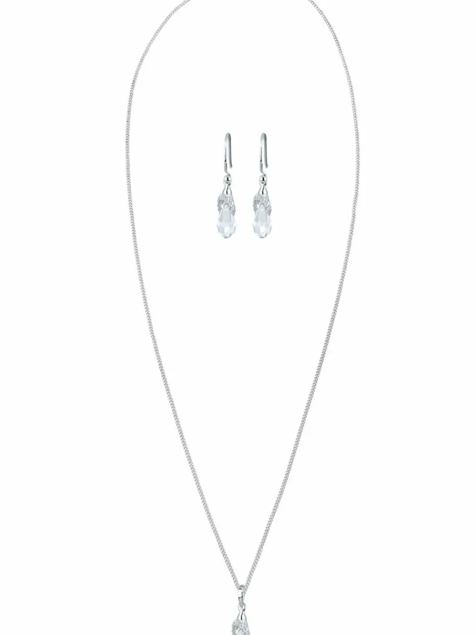 Ein wunderschön glitzerndes Schmuck-Set bestehend aus einer Halskette und Ohrhänger setzt Glanzpunkte. Das Set verzückt einem tropfenförmigem Swarovski® Kristall. Kleine Swarovski® Kristalle runden das Design ab. Ein wunderbarer Damenschmuck für einen extravaganten edlen Look.