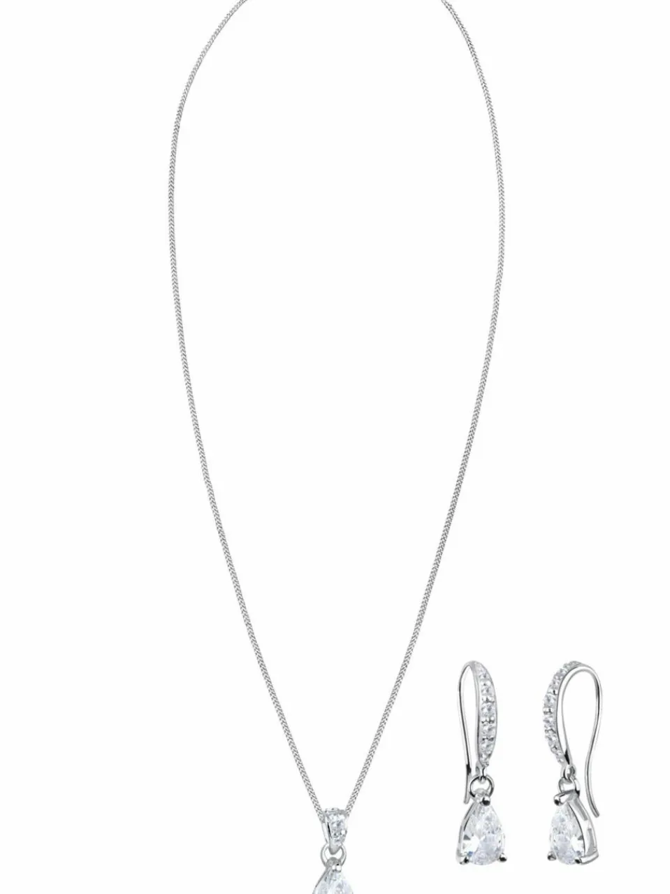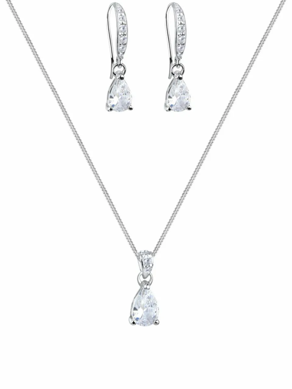 Dieses hübsche Schmuckset eignet sich für einen festlich und schicken Business Look. Die Ohrhänger und Kette ergänzen sich durch Ihre elegant funkelnden Zirkonia. Ein besonderer Blickfang des Sets sind die Zirkonia in Tropfen Form. Ein faszinierend schönes Accessoire für die Frau.