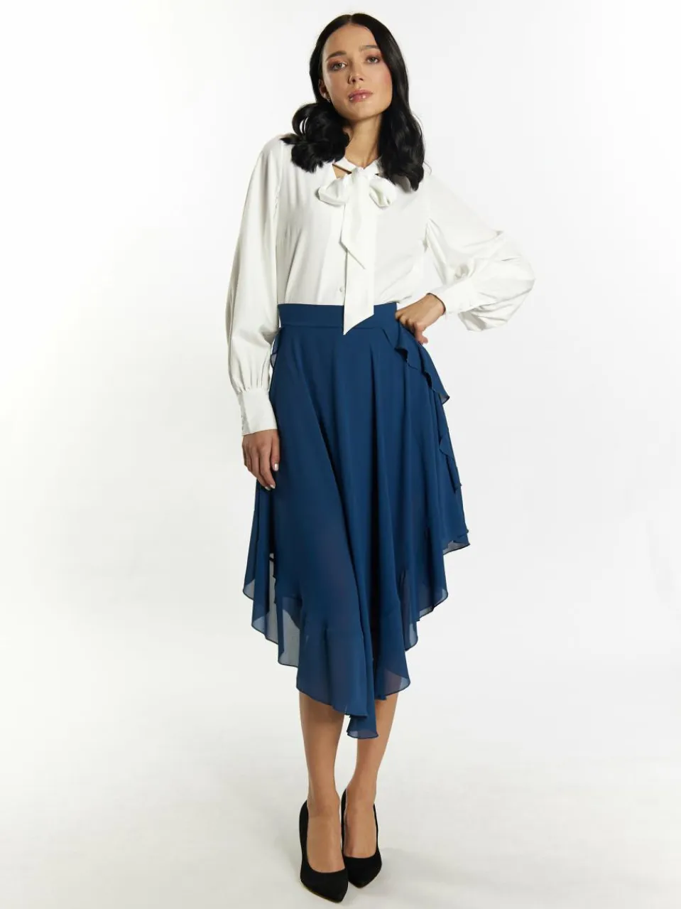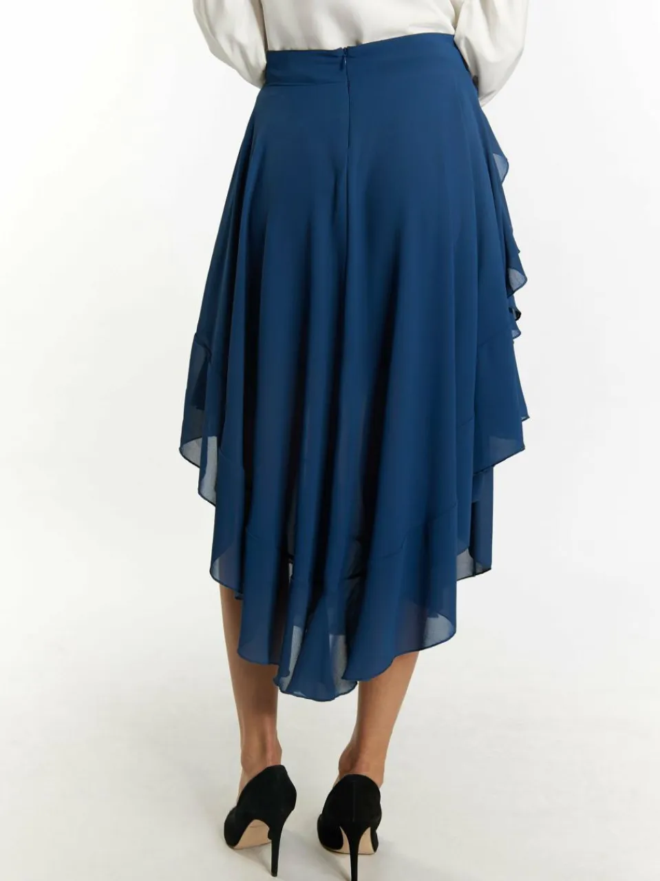 Dieser High-Rise-Rock von faina wurde in Italien aus einem weich-fließenden Material gefertigt. Er besticht durch einen asymmetrischen Saum, der sich in gewellter Rüschenform präsentiert und an den Seiten deutlich kürzer ausfällt als auf der Vorder- und Rückseite. Der hohe Bund wird mit einem rückseitigen Reißverschluss geschlossen.