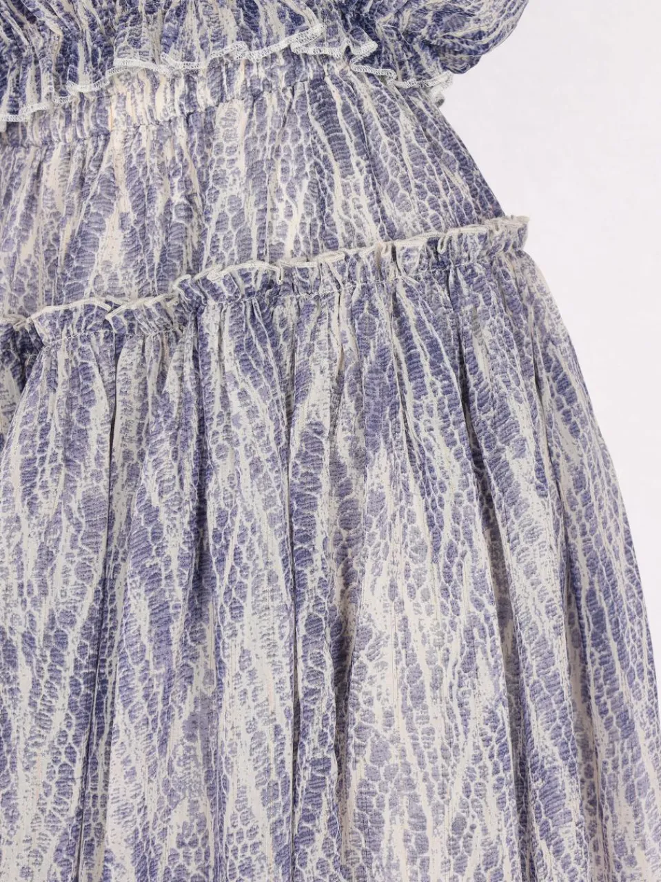 Hergestellt mit einer hohen Taille und elastischen Raffungen für eine bequeme Stretch-Passform, präsentiert dieser Rock ein gestuftes Design mit einem zusätzlichen gerafften Abschnitt, der einen gerüschten Effekt erzeugt. Das aufwendige Muster verleiht der leichten, fließenden Silhouette dekorative Raffinesse und ist perfekt für diejenigen, die lässigen Stil mit zusätzlichem Volumen und Bewegung suchen.