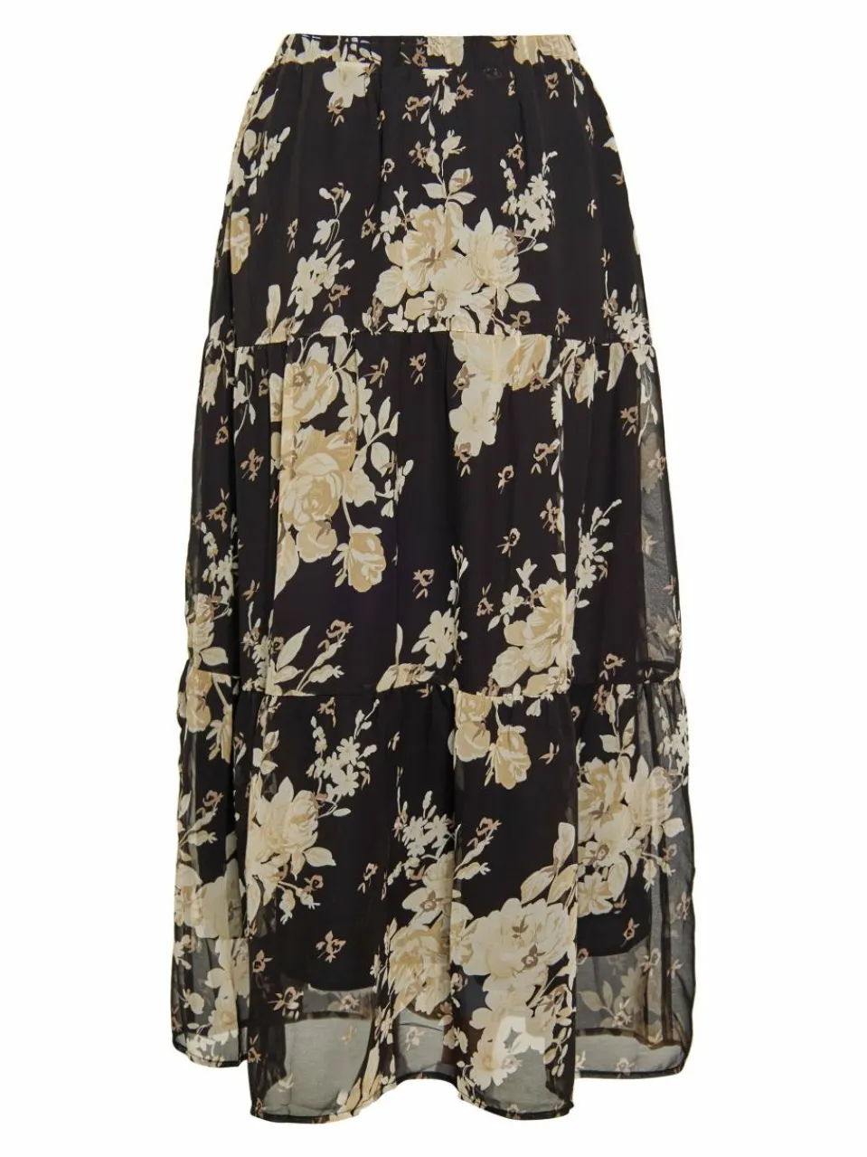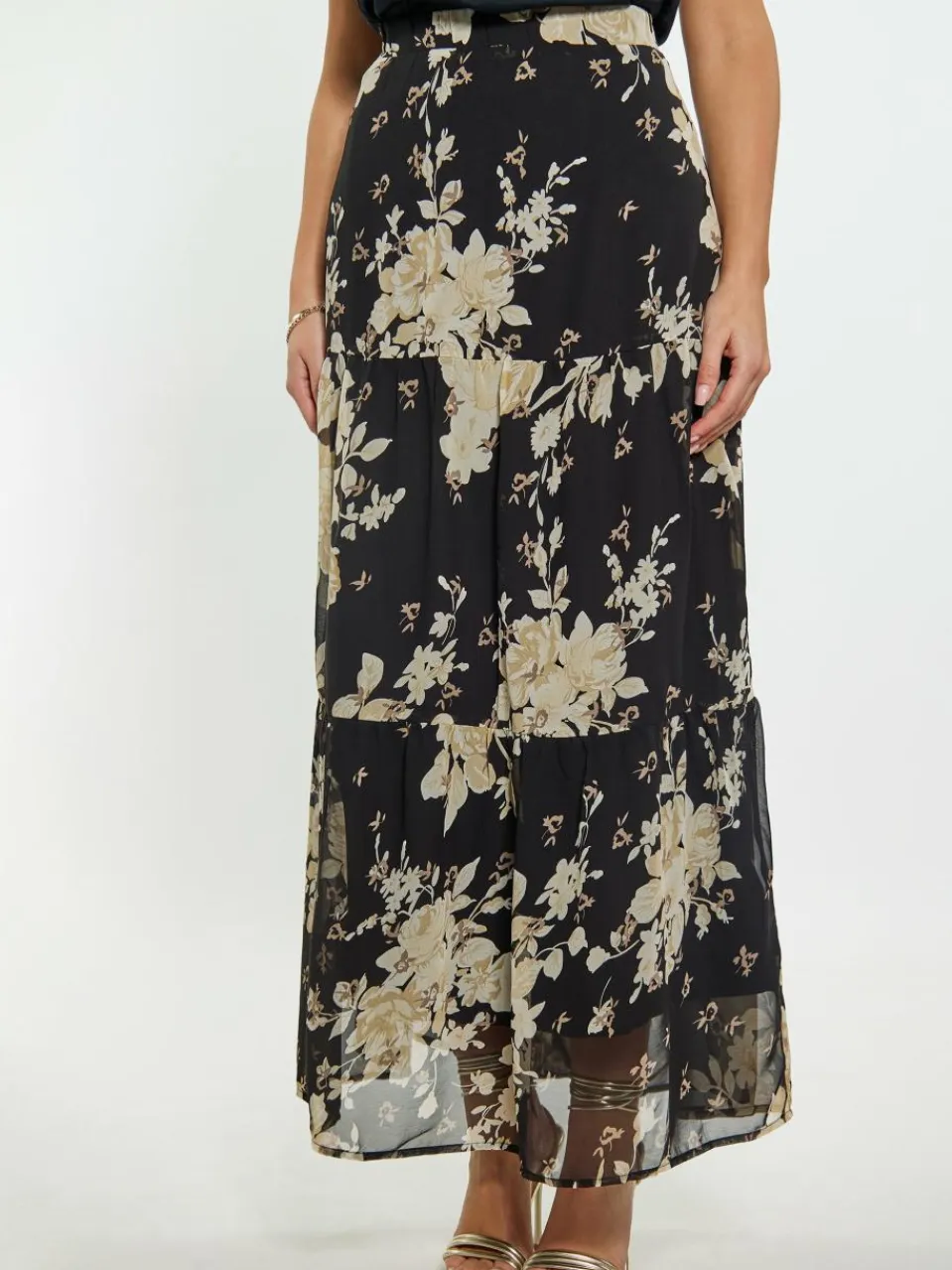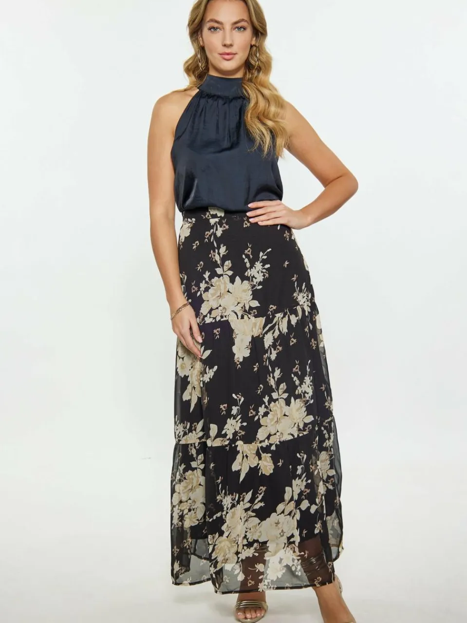 The tiered design of this enchanting A-line maxi skirt creates a voluminous silhouette, while the elastic waist ensures a comfortable fit. The semi-sheer outer fabric drapes softly for a fluid silhouette, perfect for adding movement to your look. Embrace the relaxed vibe that adds a touch of whimsy to your outfit. Featuring floral pattern in an allover print, this frill maxi skirt exudes charm.