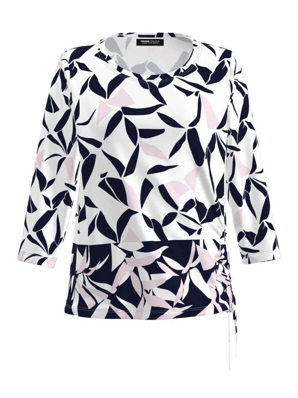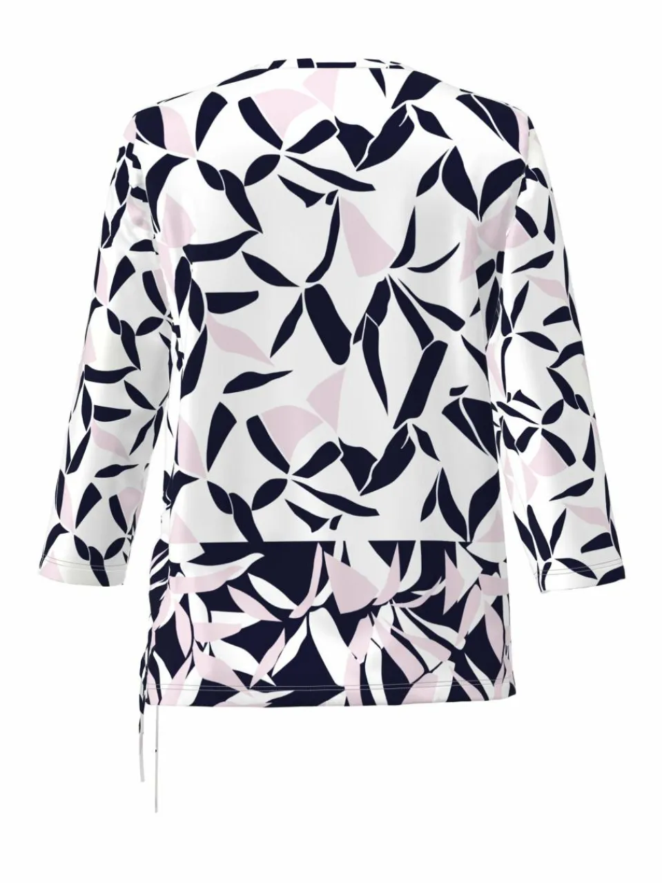 Das Shirt besticht durch einen stilvollen Allover-Print und eine seitliche Raffung mit Band, die für eine figurbetonte Silhouette sorgt. Mit seinem klassischen Rundhalsausschnitt und den 3/4-Ärmeln eignet sich das Oberteil ideal für vielseitige Outfits