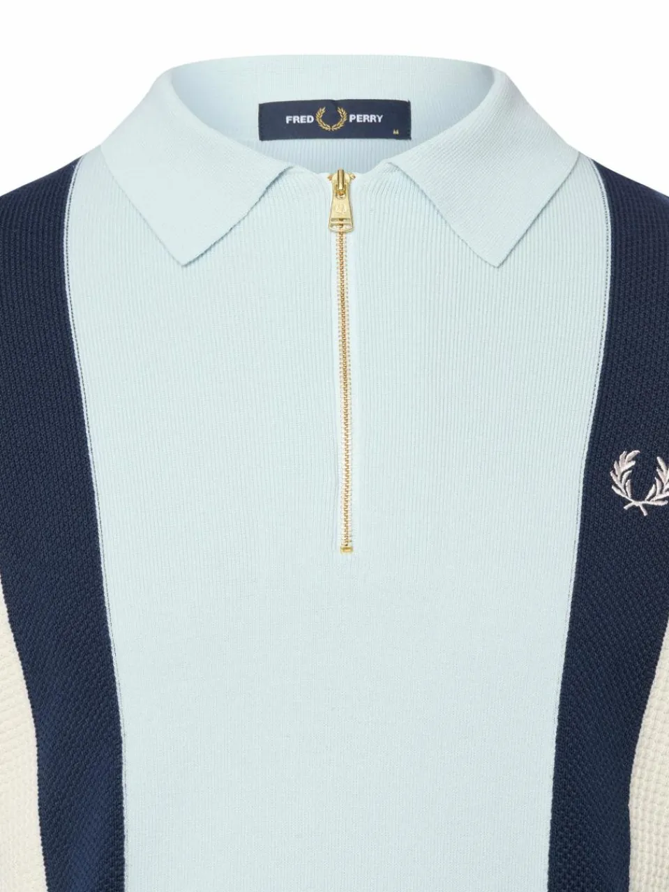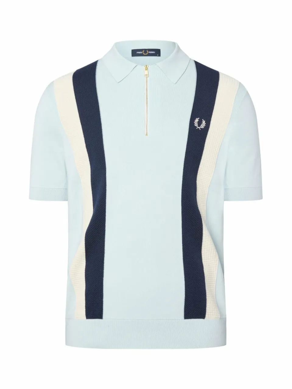 Der Strickmix und die Poloshirt-Silhouette mit kurzem Zipper am Kragen zeichnen den casual sportiven Look des Fred Perry Styles aus.