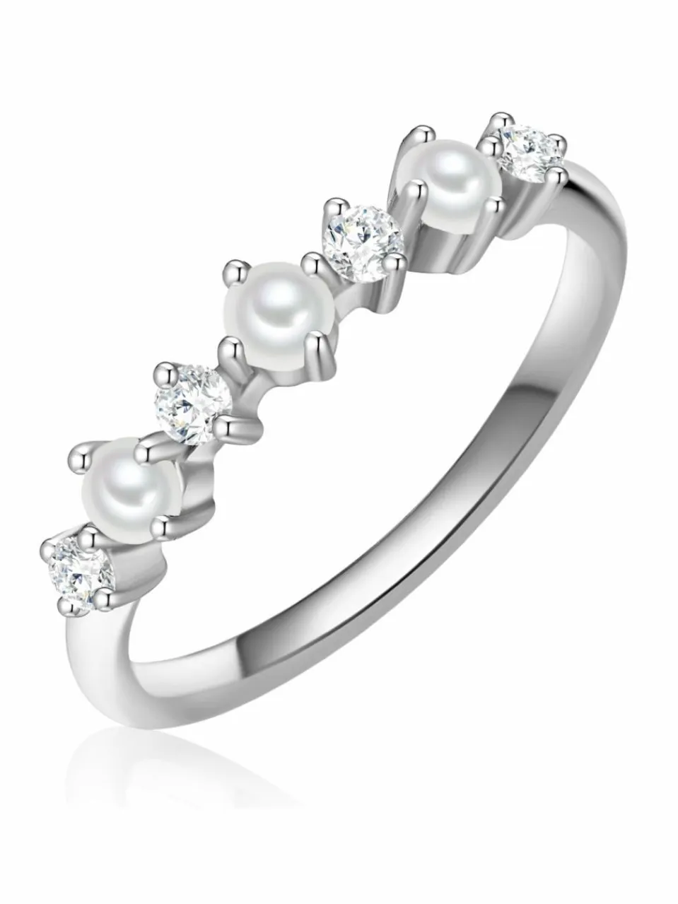 Du bevorzugst stilvolle Accessoires, die nicht jeder hat? Dann sollte dieser Perlen-Ring des Labels Glanzstücke München in deiner Schmucksammlung nicht fehlen! Der edle Materialmix im Vintage-Stil fasziniert mit einer zierlichen Ringschiene, die mit drei buttonförmigen, sanft schimmernden Süßwasser-Zuchtperlen und vier funkelnden Zirkonia-Kristallen in Krappenfassungen besetzt ist.