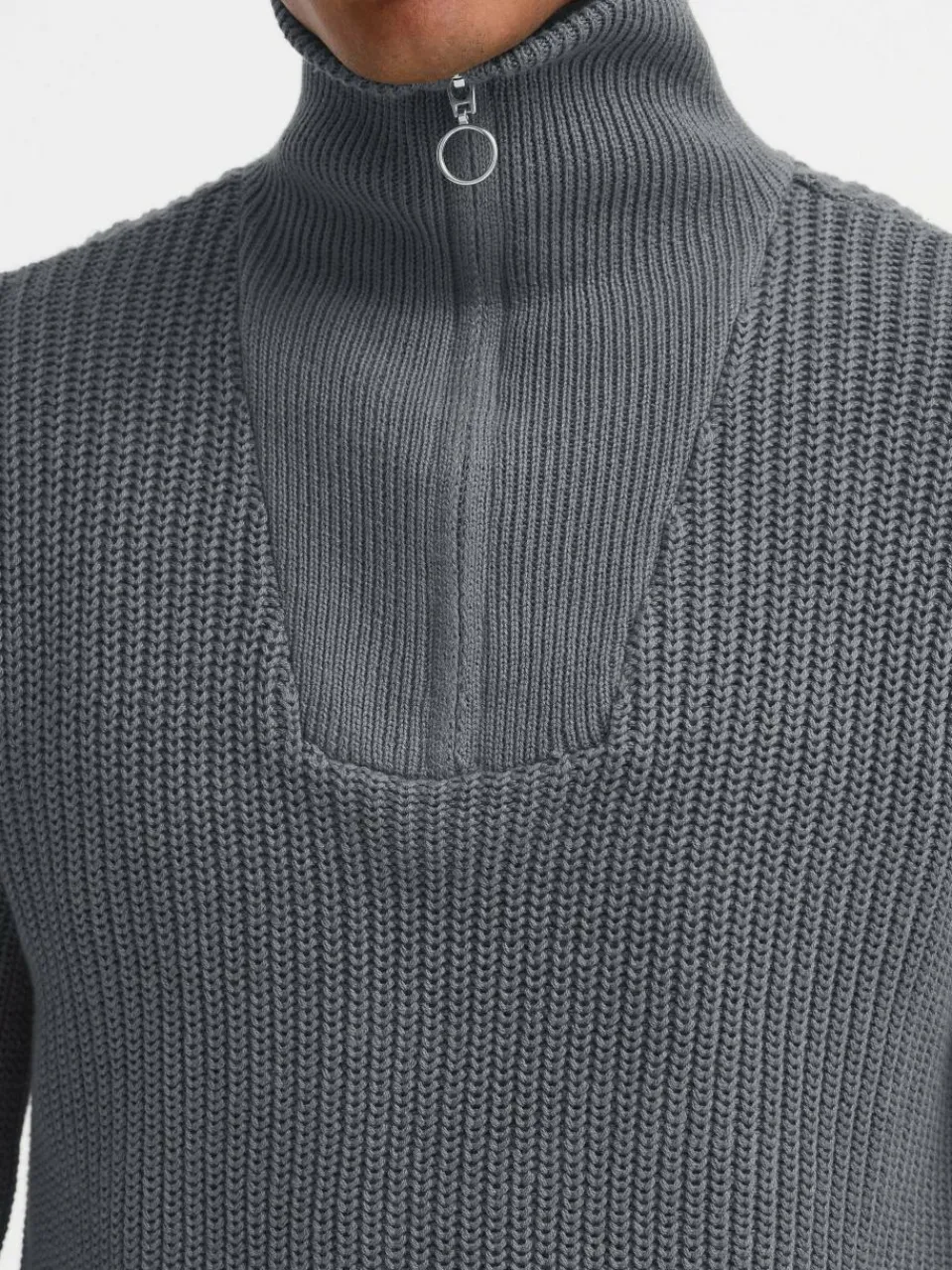 Dieser Herren-Troyer aus Grobstrick besticht mit markanter Maschenstruktur und wärmender Qualität. Der Quarter-Zip mit hohem Stehkragen schützt vor kühler Brise und verleiht maritimen Charme. Ob mit Chino für einen Hafenspaziergang oder mit Jeans für den Stadtbummel ein Strickklassiker mit Charakter.