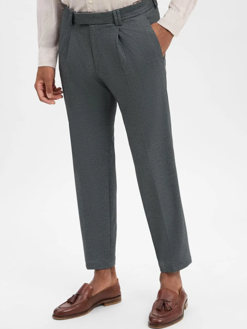 Klassische Bund- und Bügelfalten zieren die Anzughose Cisando von Cinque, doppelte Gürtelschlaufen setzen elegante Akzente. Die Hose ist Teil eines Baukasten-Anzugs, kann aber auch allein getragen werden.