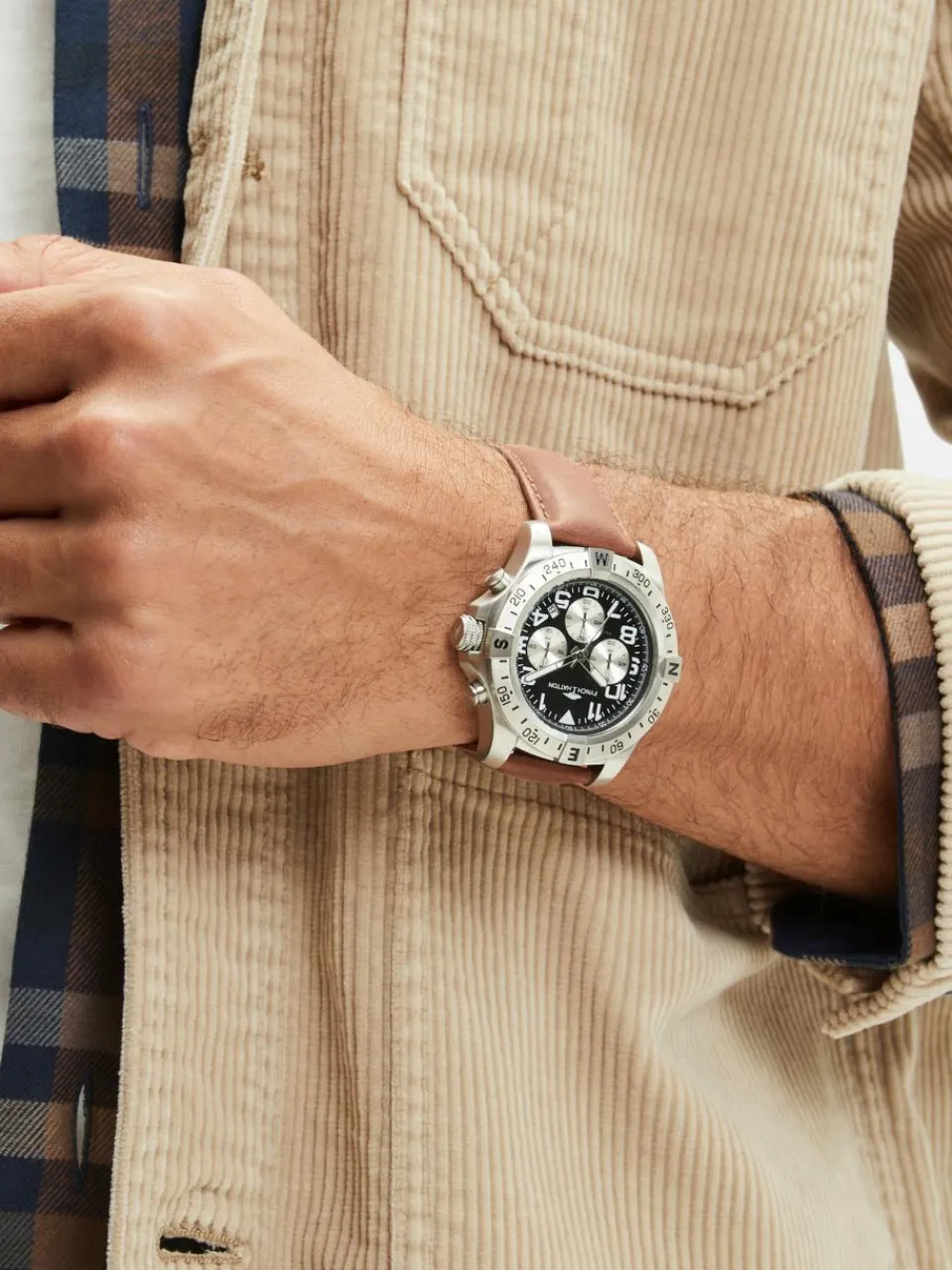 Edelstahlarmbanduhr mit Chronographenfunktion und Lederband von Fynch-Hatton.