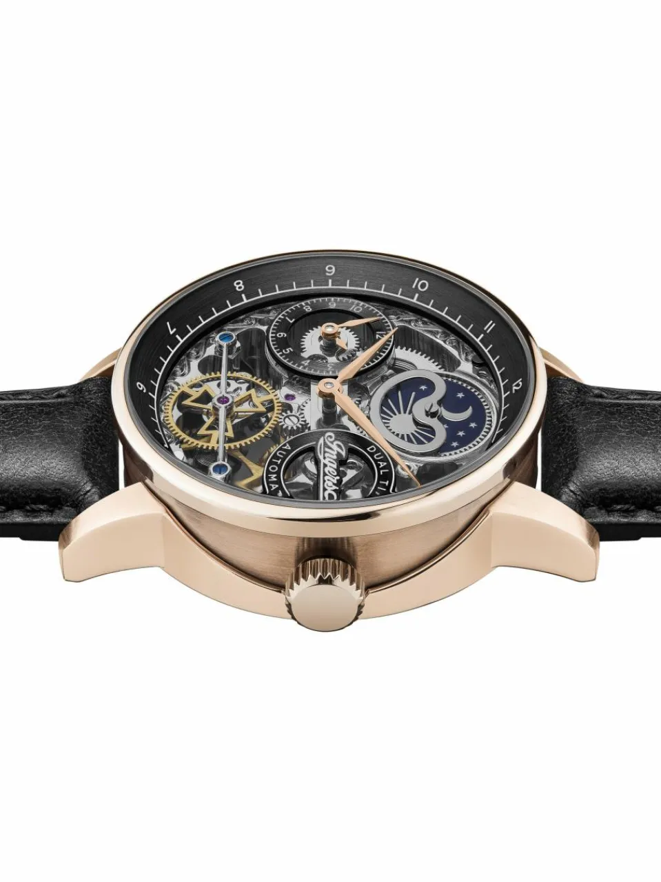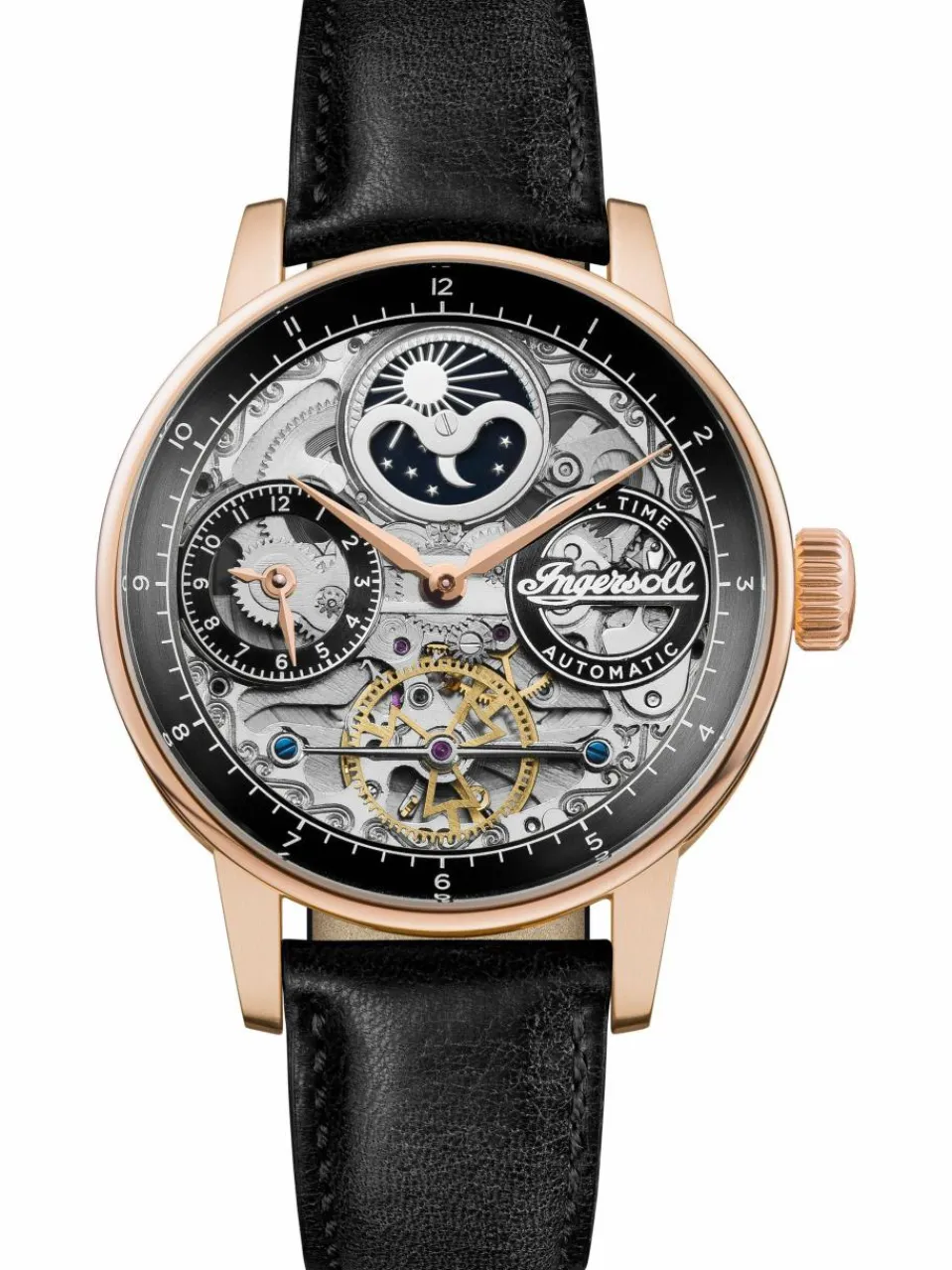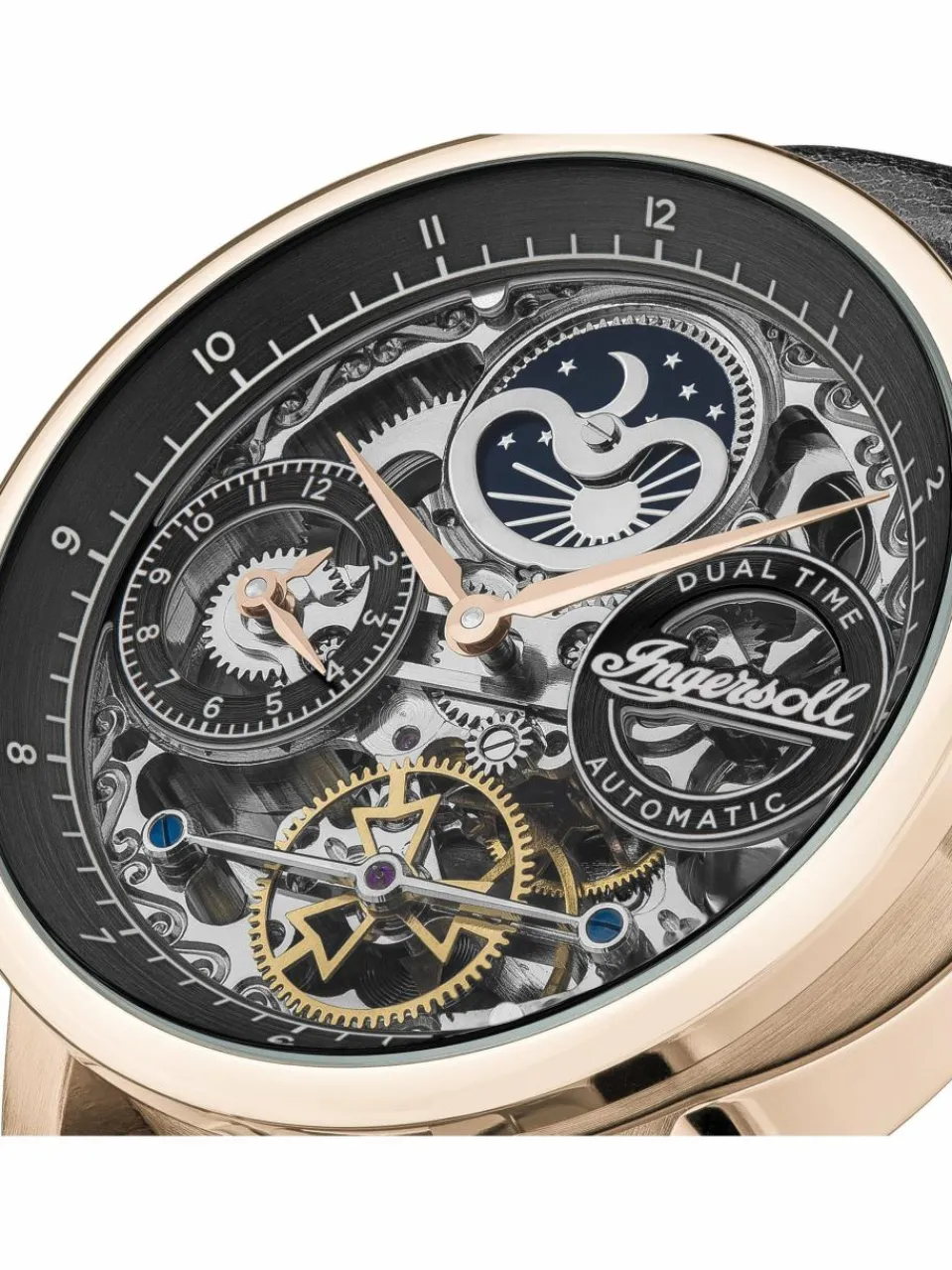 Diese hochwertige Ingersoll Uhr der Serie The Jazz besticht durch ihr skelettiertes Ziffernblatt, wodurch das Automatik-Uhrwerk sichtbar wird. Das Gehäuse besteht aus Edelstahl und ist in Kombination mit der Dual-Time und Mondphasenzeige ein echter Hingucker. Jede Ingersoll Uhr wird in einer hochwertigen Kunstlederbox verpackt.