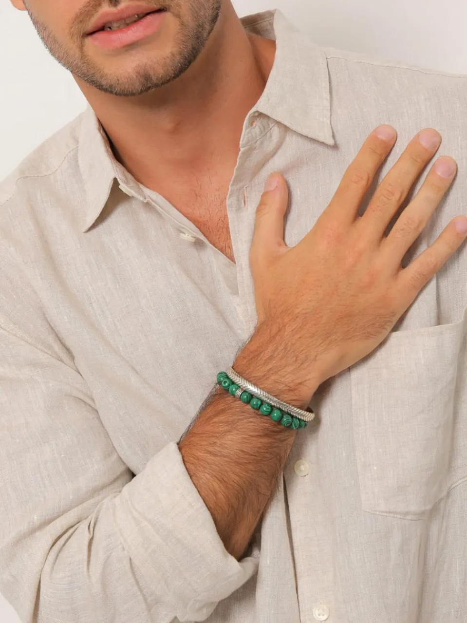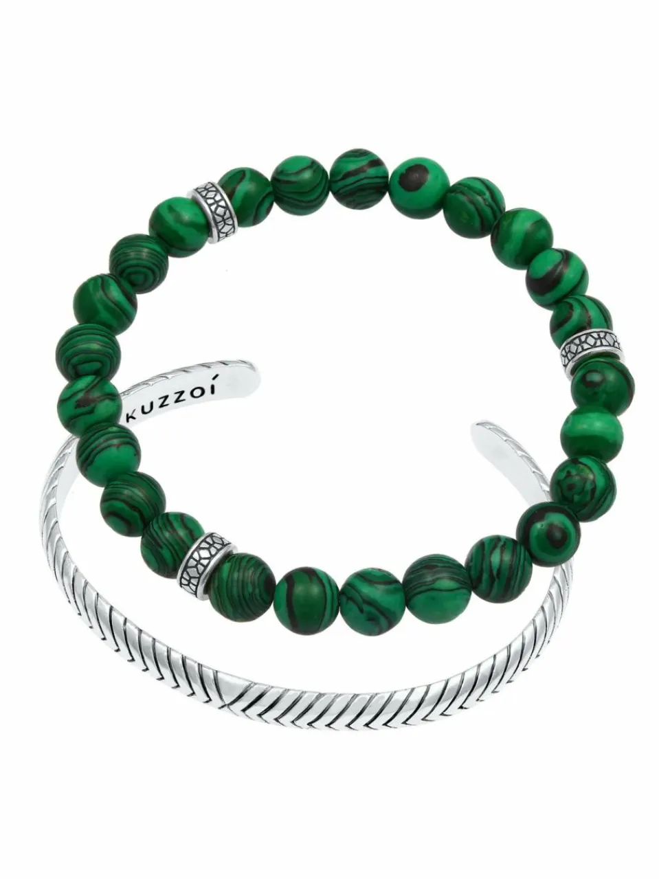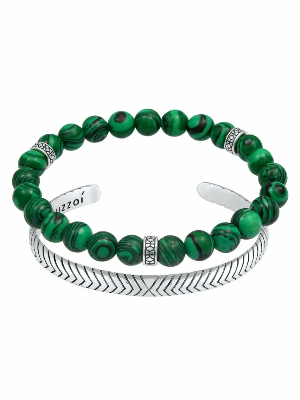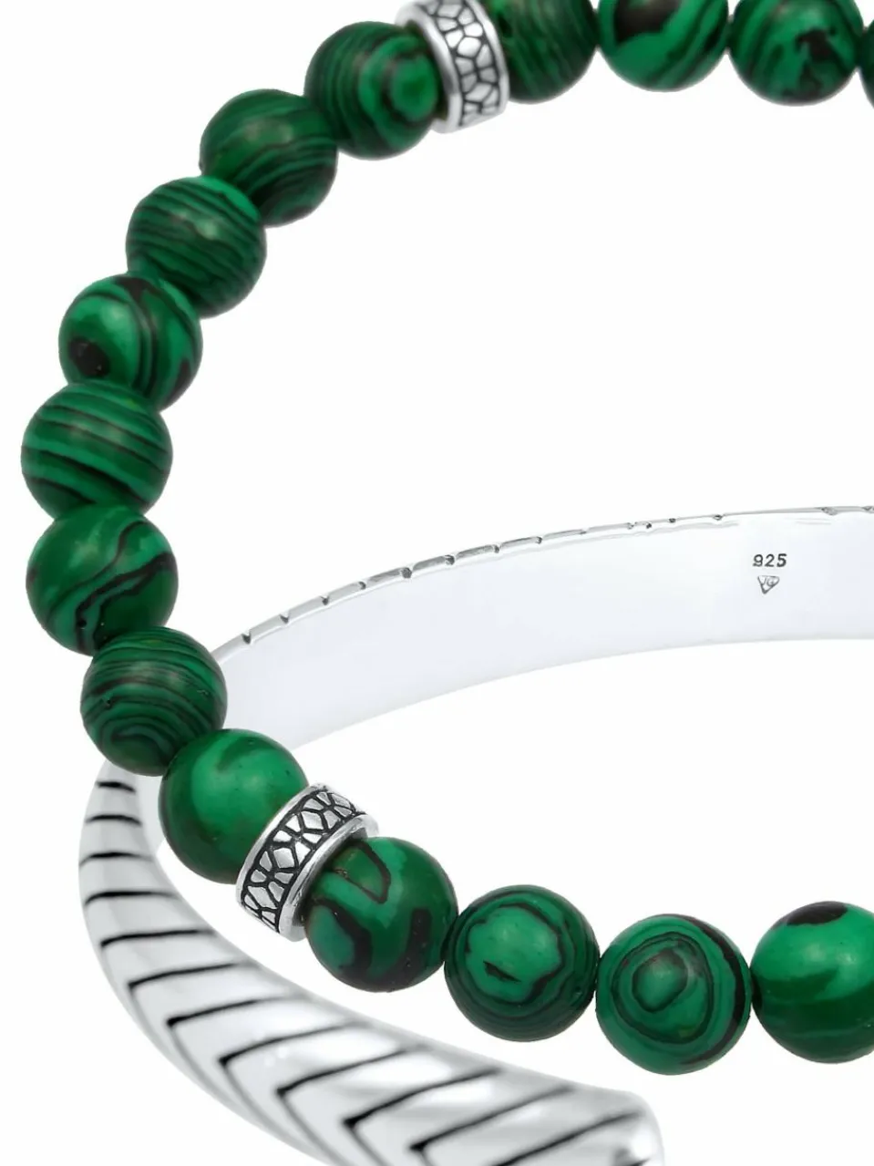 Eine sagenhafte Kombination für Männer aus Steinarmband und Armreif. Das Stein Armband aus synthetischen Malachit Perlen schafft ein einzigartiges Aussehen. Das geschmackvolle Design wird durch oxidiert Element betont. Gepaart mit einem offenen Armreif im Biker Design ist der lässiger Style garantiert. Dieses perfekte Herren Set ist ein Accessoire für jeden Anlass. Für Frauen die ein markantes Armband suchen, eignet sich die Länge von 19 cm.Der offene Armreif ist grössenverstellbar. Da es sich bei Leder um ein Naturprodukt handelt, kann dessen Farbe und Stärke vom Bild abweichen.Dieses exklusive Schmuckstück wird in einem eleganten Geschenk-Etui geliefert.