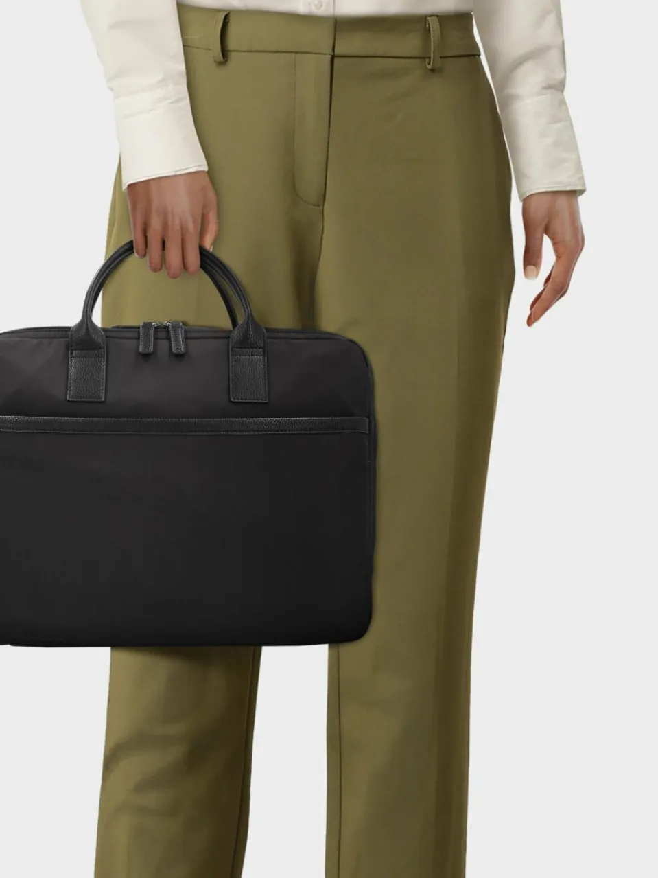 Das glatte, strapazierfähige Nylon macht diese große Laptoptasche unglaublich langlebig und vielfältig einsetzbar. Das Hauptfach der Tasche lässt sich mit einem Reißverschluss schließen und die beiden extra Fächer vorne und hinten bieten zusätzlichen Stauraum. Das gepolsterte Tabletfach zusammen mit der praktischen Trolleyaufsatzschlaufe ermöglicht ein sicheres und bequemes Reisen. Kombiniert mit Anzug oder Stoffhose und Shirt gibt diese Tasche jedem Office-Outfit einen lässigen Touch. Organisation trifft Eleganz!