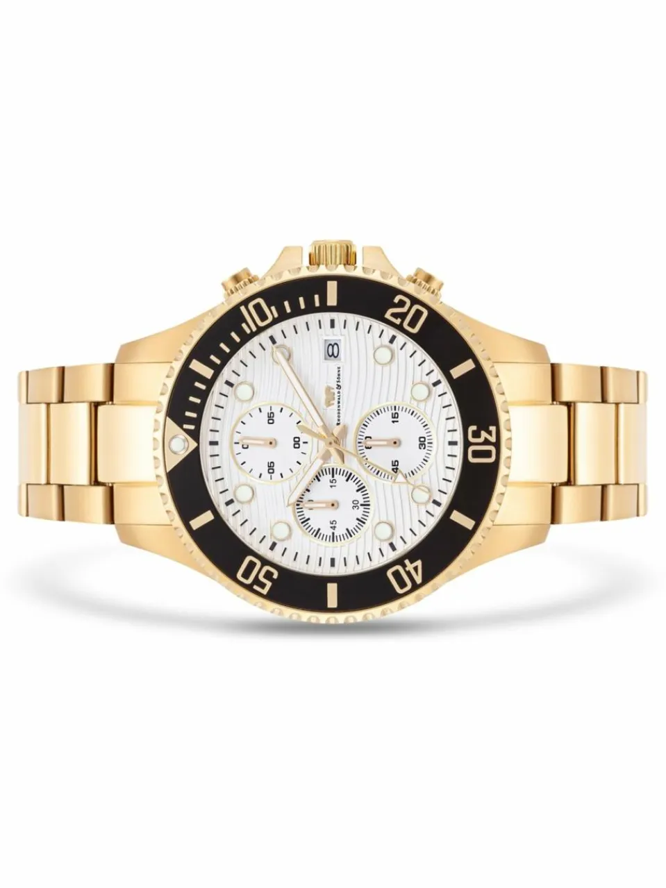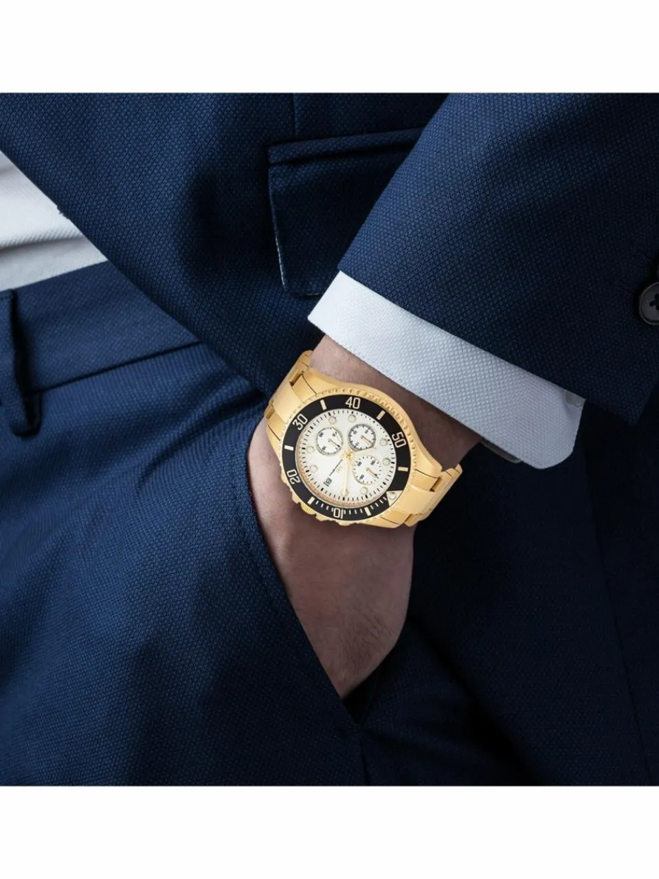 - Edelstahlgehäuse (44 mm) mit IP-Veredelung Gelbgold