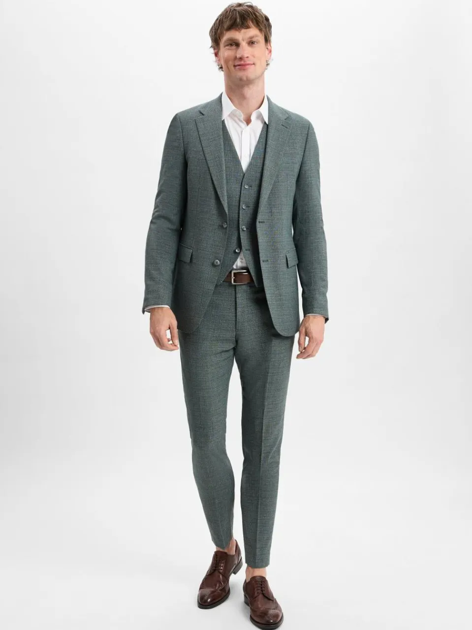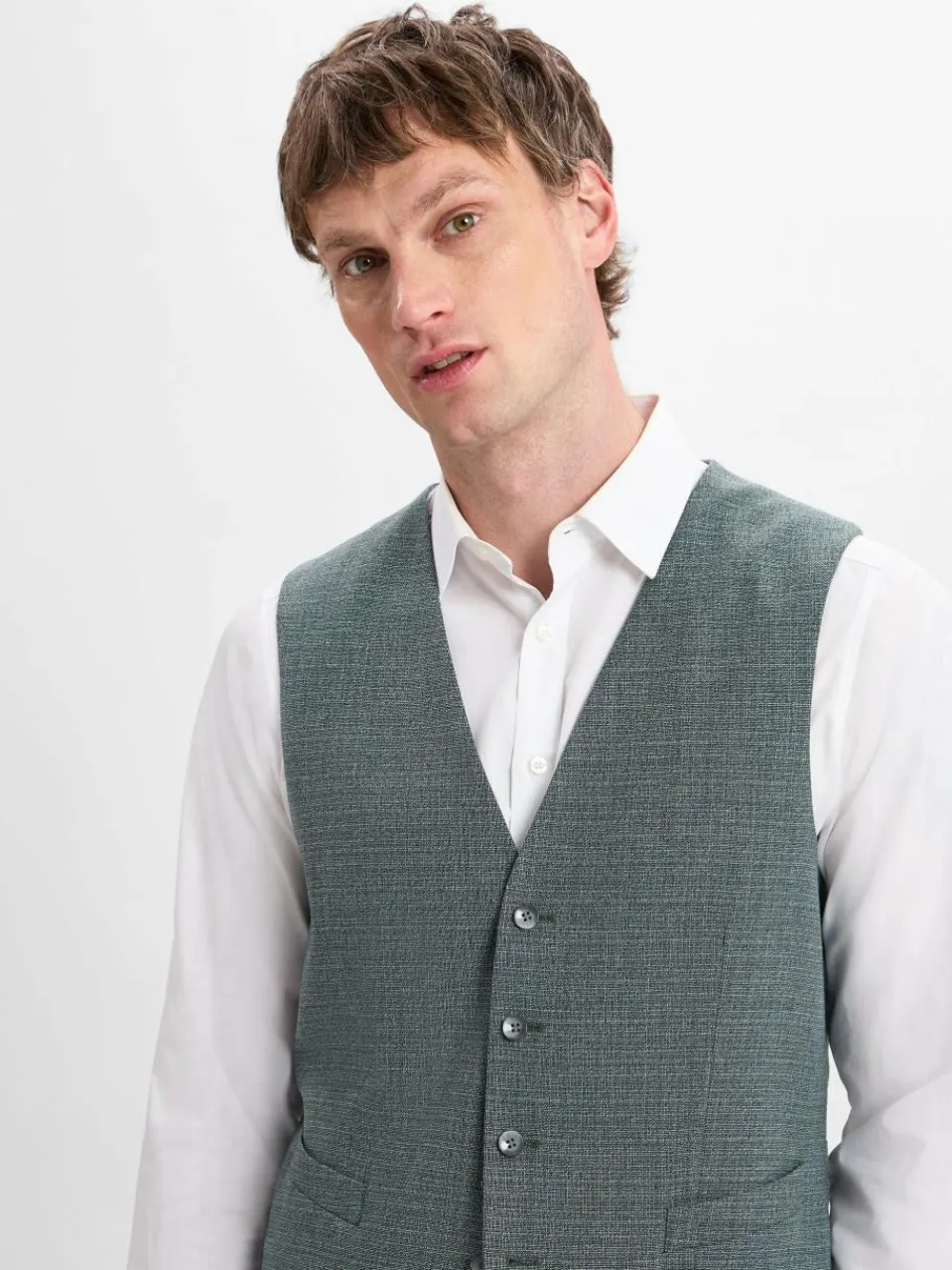 Zeitlos elegant: Anzugweste Gyl2 von Strellson mit V-Ausschnitt, Knopfleiste und verstellbarem Riegel – aus strukturiertem Viskose-Mix. Die Weste ist Teil eines Baukasten-Anzugs, kann aber auch allein getragen werden.