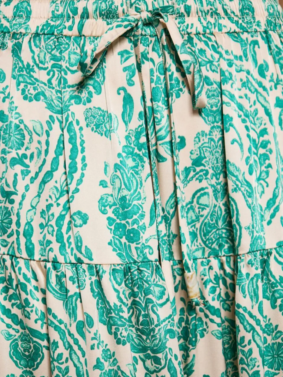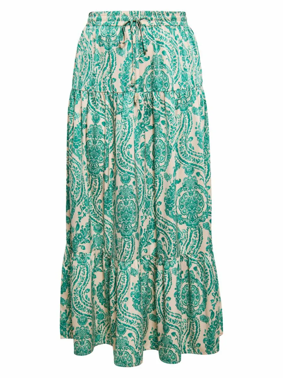 Enhance your summer look with this floral-print maxi skirt. The ruffled waist with drawstring closure provides a customized fit, while the flared A-line silhouette and ruffled hem add femininity. Made of lightweight satin, the skirt provides comfort and freedom of movement.