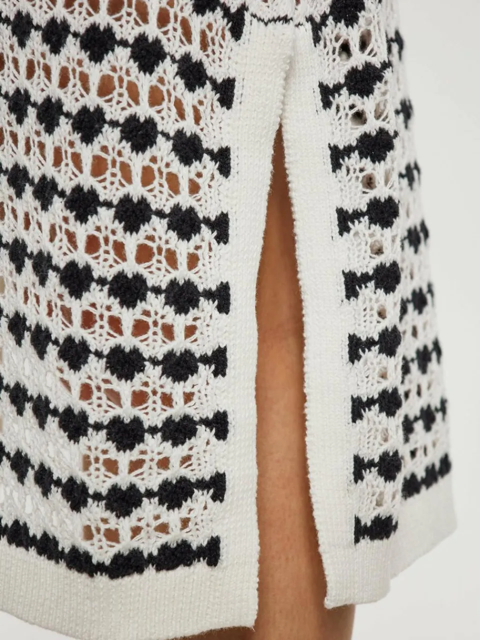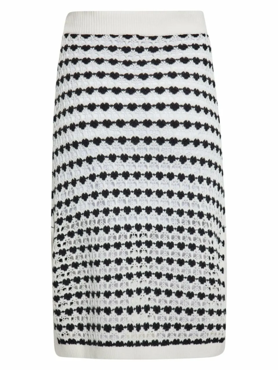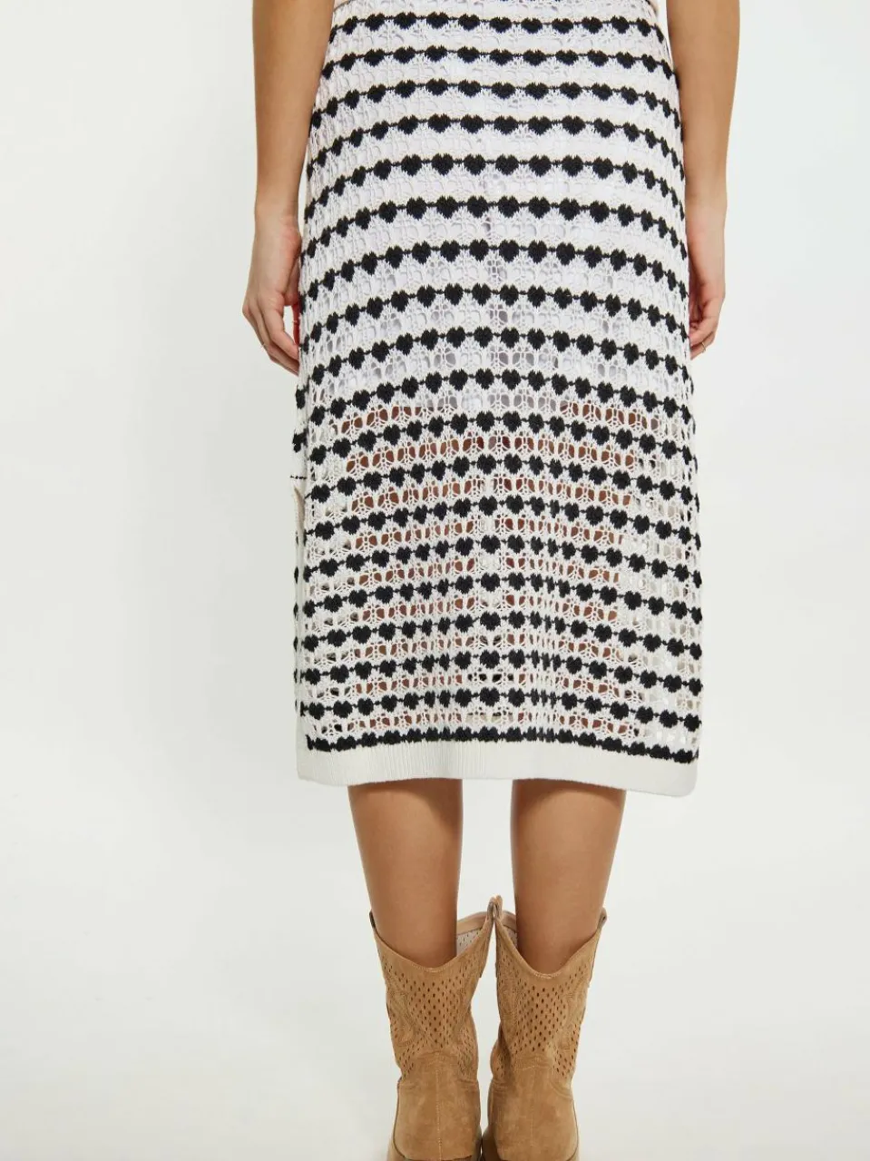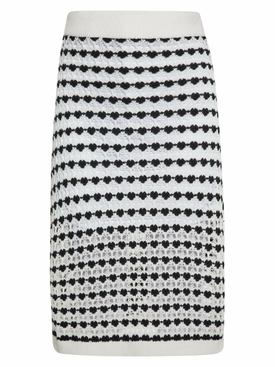 Unveil a stunning Crochet midi skirt that exudes summertime charm. This knitted masterpiece boasts a textured, patterned design with horizontal bands and a repeating motif for visual allure. The elasticated waistband ensures a comfortable, stretchable fit while the straight cut hugs the hips and waist elegantly. Ideal for beachwear