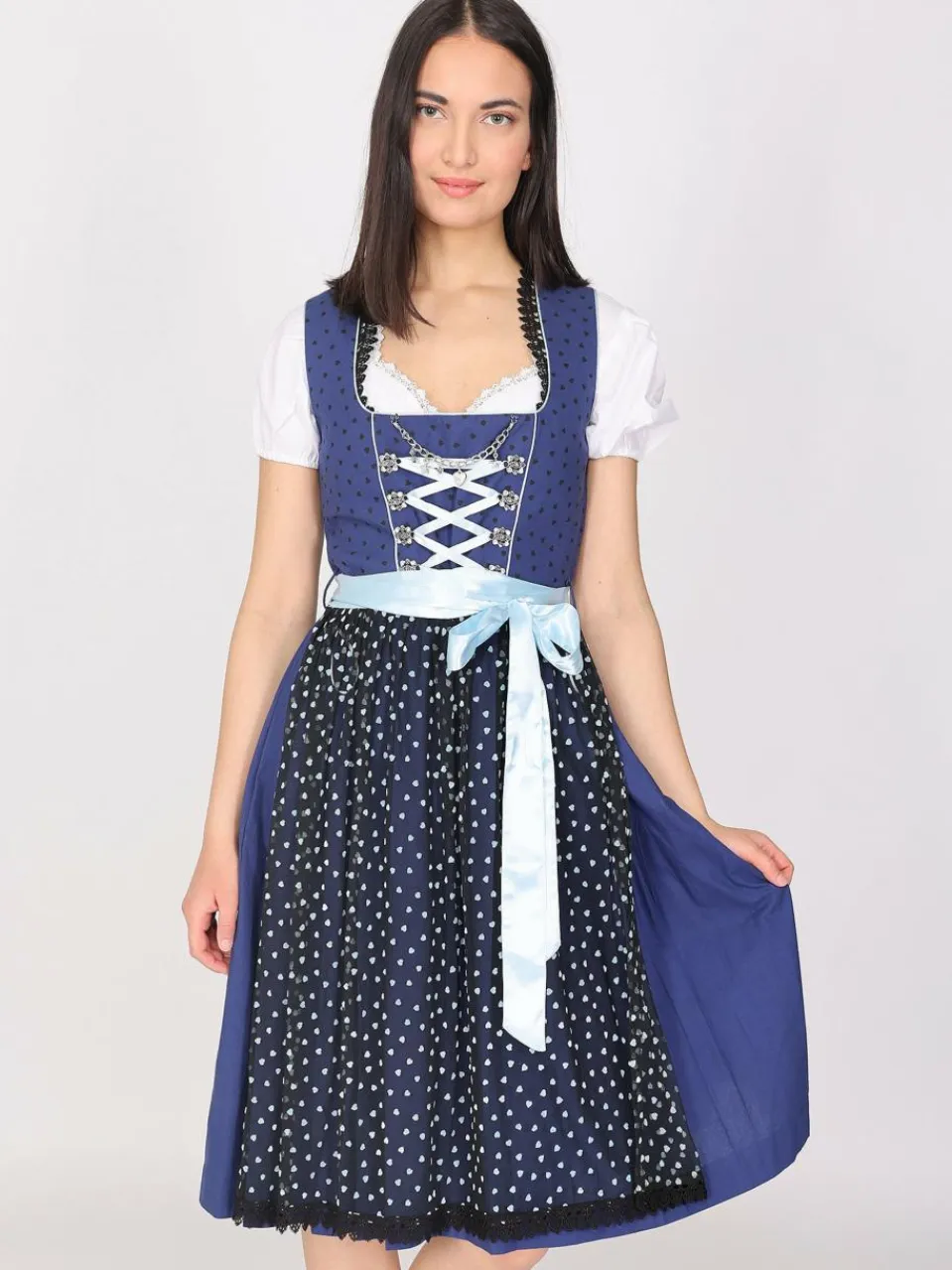 Fesches Dirndl mit Herzchen. Die klassische Schnüroptik im vorderen Bereich wird durch eine Schmuckkette bereichert. Der Gürtel mit Schleife darf natürlich nicht fehlen. Das Dirndl wird ohne Bluse verkauft.