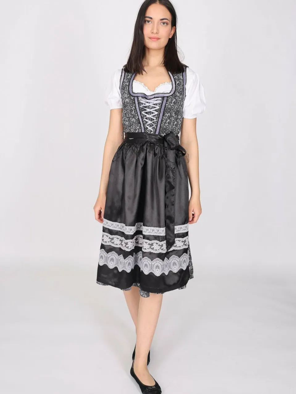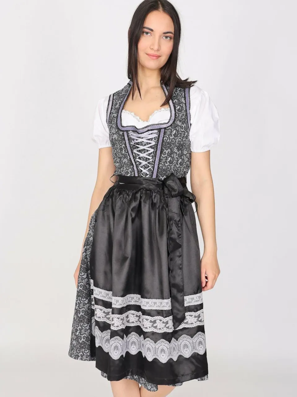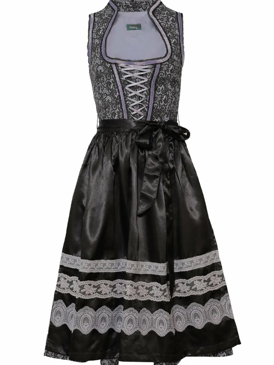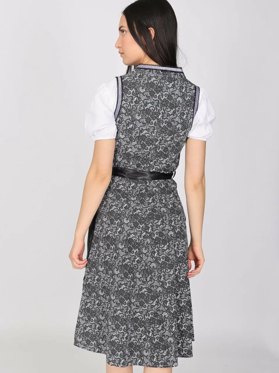 Dieses elegante Dirndl überzeugt durch seine edle Spitzen-Optik und die stilvolle Farbgebung in klassischem Schwarz. Feine lila Ziernähte setzen raffinierte Akzente und verleihen dem Dirndl eine feminine Note. Die glänzende Schürze mit schwarzem Bindegürtel wird durch drei kunstvoll gestaltete Bordüren haronisch abgerundet.Das Dirndl wird ohne Bluse verkauft.