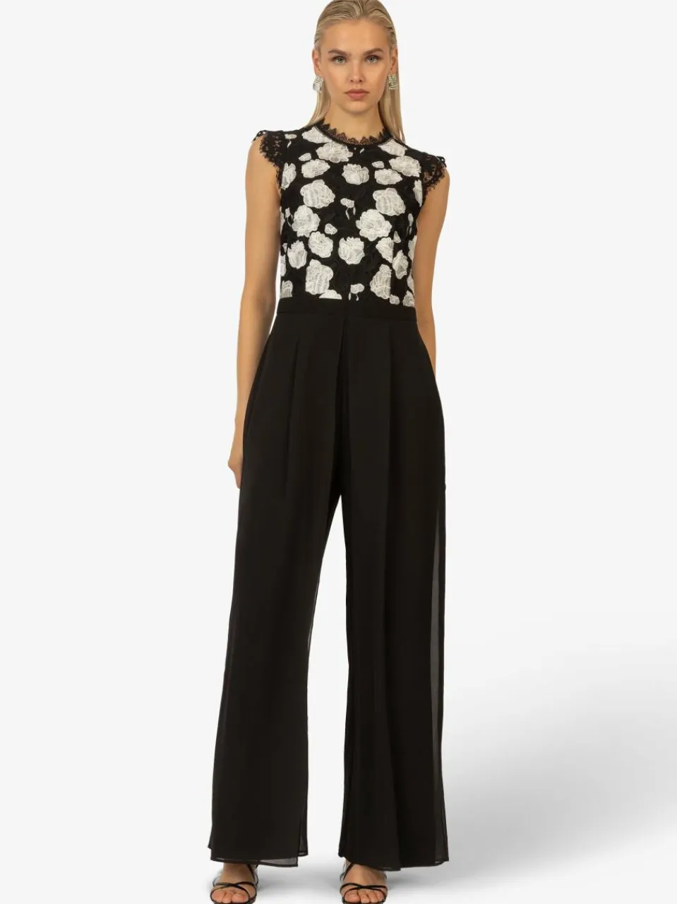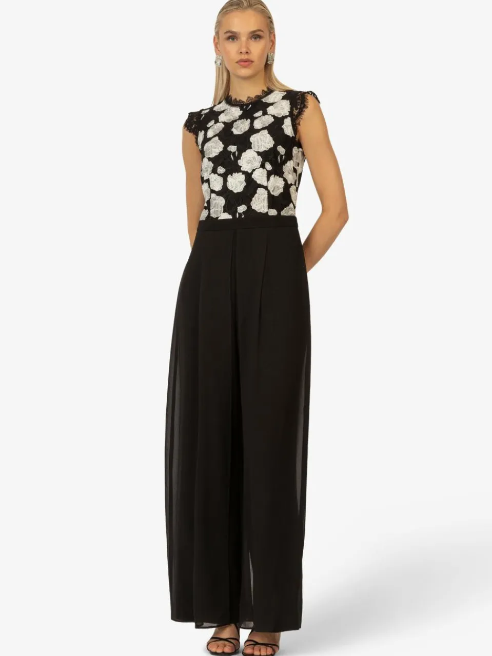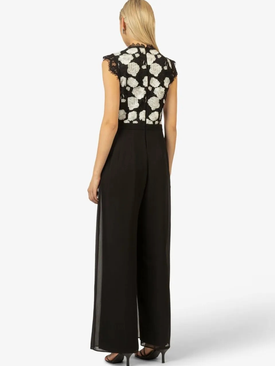 Dieser elegante Abendoverall kombiniert moderne Eleganz mit einem femininen Touch. Das ärmellose Spitzentop mit floralem Muster verleiht dem Look eine edle Note, während die hohe Taille die Figur wunderschön betont. Die fließenden, weit geschnittenen Hosenbeine sorgen für eine elegante Bewegung und angenehmen Tragekomfort. Dank des dezenten Reißverschlusses auf der Rückseite lässt sich der Overall leicht an- und ausziehen. Perfekt für festliche Anlässe, Galas oder Abendveranstaltungen.