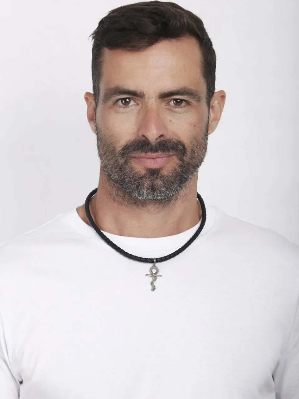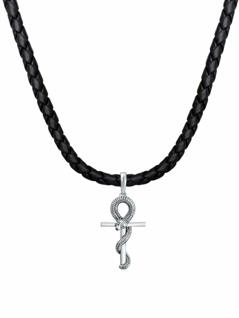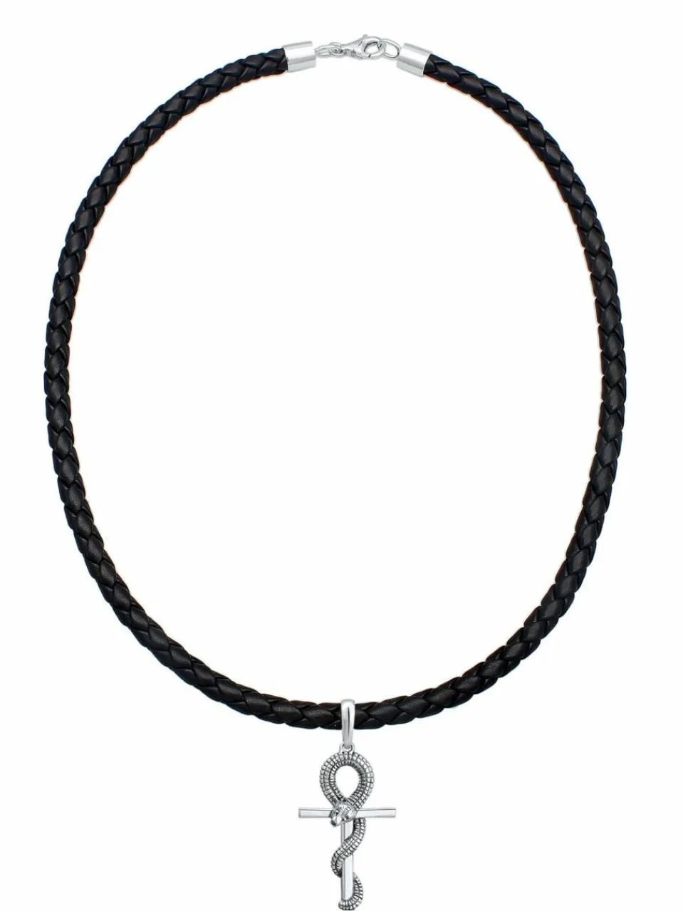 Trendige Leder Halskette für den Mann mit ausgefallenen Kreuz Anhänger aus 925er Sterling Silber gefertigt. Die Herrenkette ist aus schwarzem Echtleder geflochten mit Karabinerverschluss gefertigt. Die Besonderheit ist eine Schlange auf dem Kreuz Anhänger umschlungen und im schlichten oxidierten Design gehalten. Ein Schmuckstück im rockigen Biker Style für alle modebewussten Männer.Da es sich bei Leder um ein Naturprodukt handelt, kann dessen Farbe und Stärke vom Bild abweichen. Jedes Schmuckstück ist daher individuell und bekommt mit der Zeit eine persönliche Patina. Dieses exklusive Schmuckstück wird in einem eleganten Geschenk-Etui geliefert.