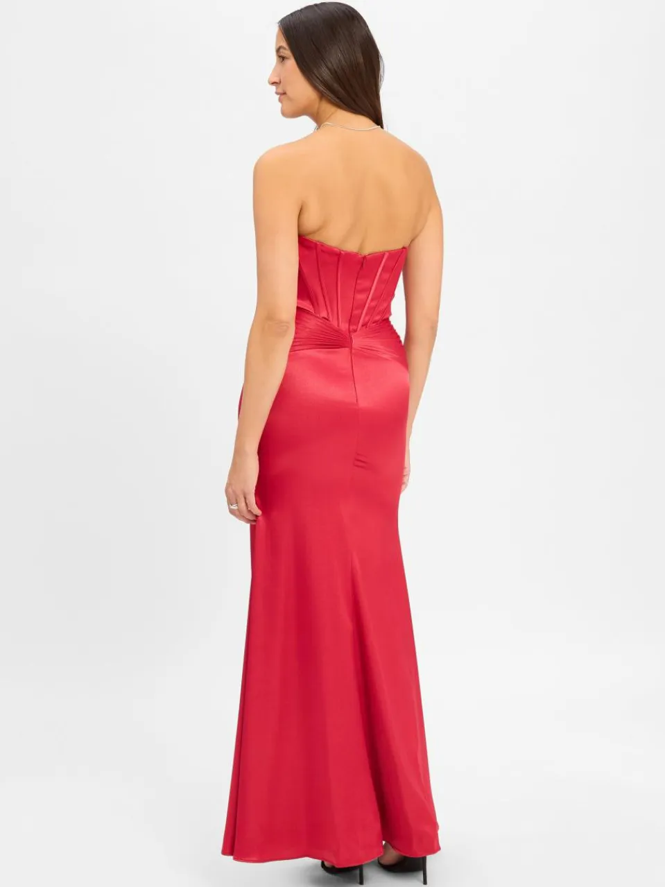 Glamouröses Abendkleid von Luxuar Fashion aus edlem Satin mit einem eleganten Corsagen-Design, integrierten wattierten Cups und hohem Frontschlitz – komfortabel ergänzt durch ein fixiertes Unterkleid.