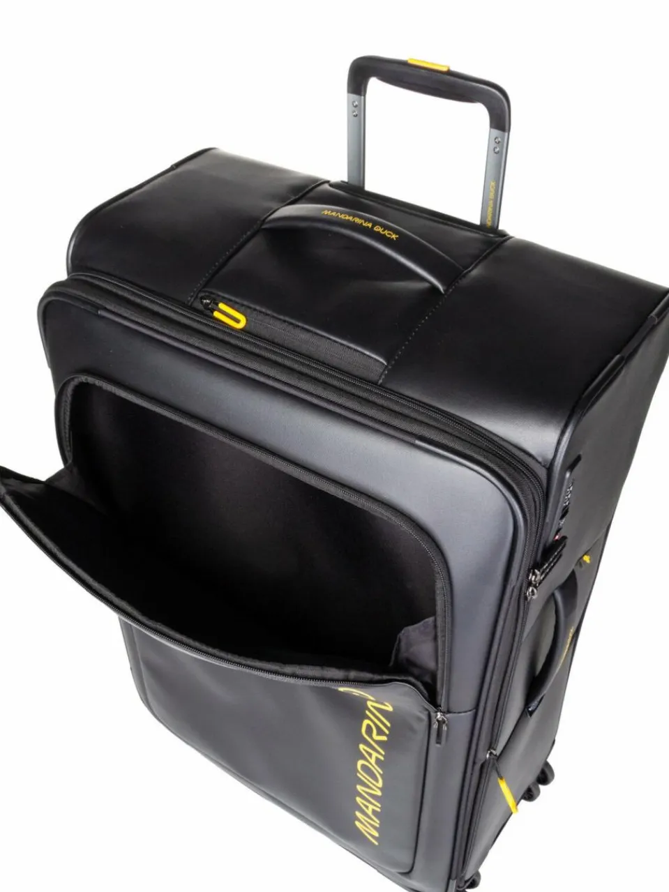 Dieser leichte, robuste Koffer von Mandarina Duck besteht aus recyceltem, beschichtetem Polyester und bietet Stil und Funktionalität.