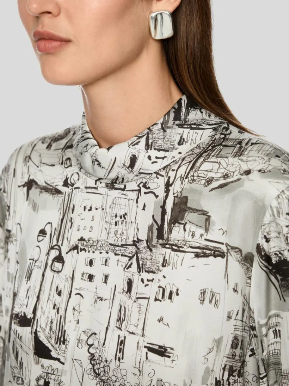 Moderne Bluse aus fließender Viskose mit lockerem Schnitt und CITY-Motiv in handgescribbelter Optik. Voluminösere Ärmel mit gerafften Bündchen und unifarbener Saumbesatz setzen modische Akzente. Der Schlitz mit Knöpfen im Nacken rundet das Design feminin ab – perfekt für stylische City-Looks.