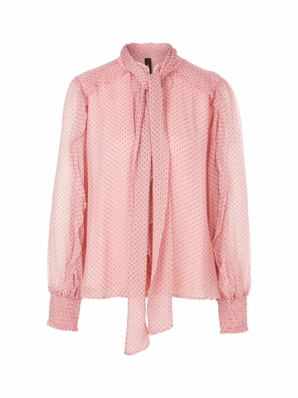 Lässig weite Schluppenbluse in weichfließender Viskose. Das Gewebe ist semitransparent und in Vorder- und Rückenteil zweilagig. Die Silhouette ist durch die Schulterpasse und den gesmokten Ärmelsaum akzentuiert. Nimmt man die Schluppe ab, zeigt sich darunter ein Stehkragen. Verspieltes Detail: Zarte Volants an der Schulterpasse und entlang der Ärmel.