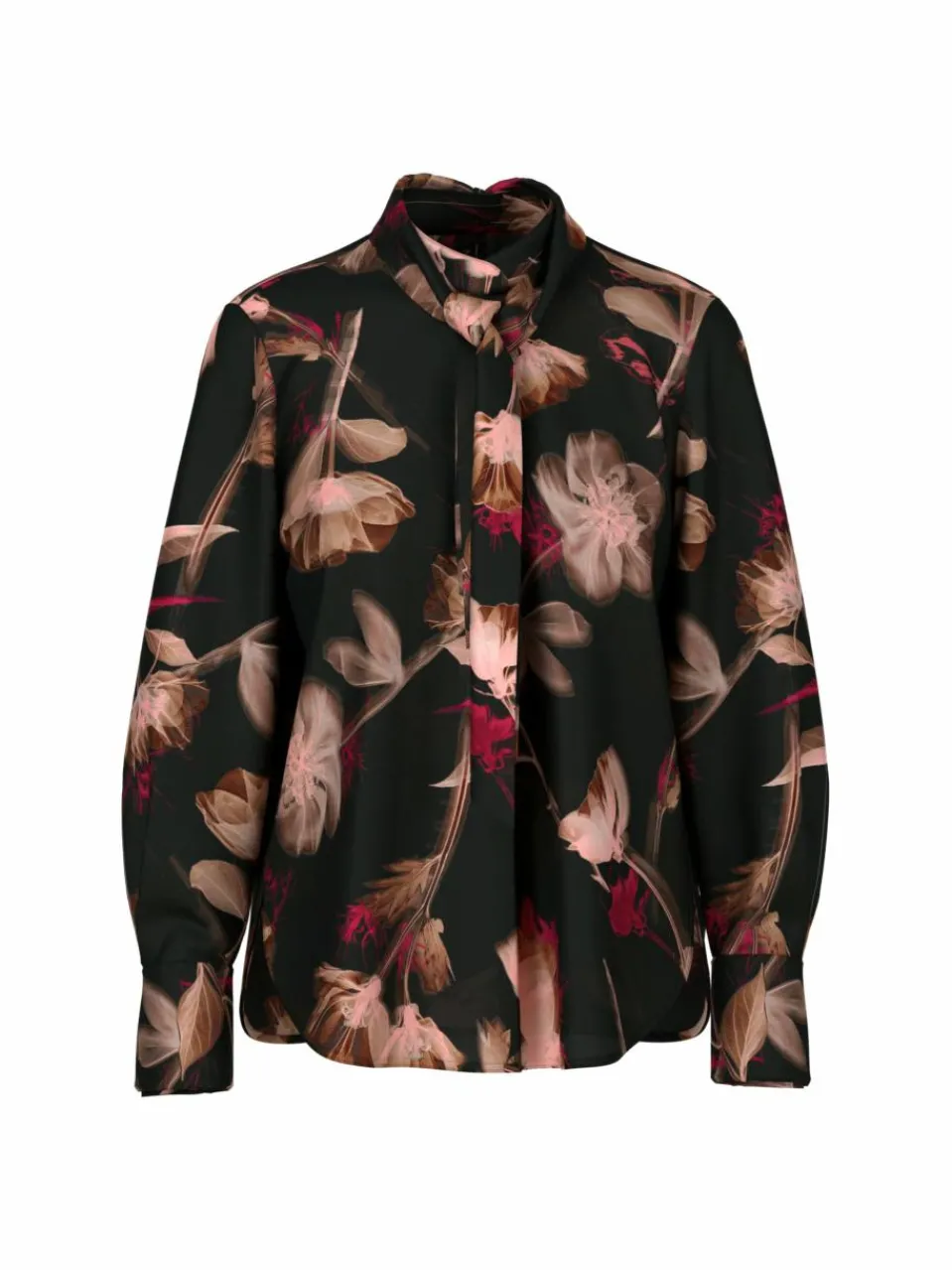 Elegante Bluse aus Seide mit abnehmbarer Schluppe und femininem, floralem Print. Der lockere Schnitt, ein tiefer V-Ausschnitt und feine Ärmelschlitze verleihen ihr eine luftige Leichtigkeit und edle Ausstrahlung.
